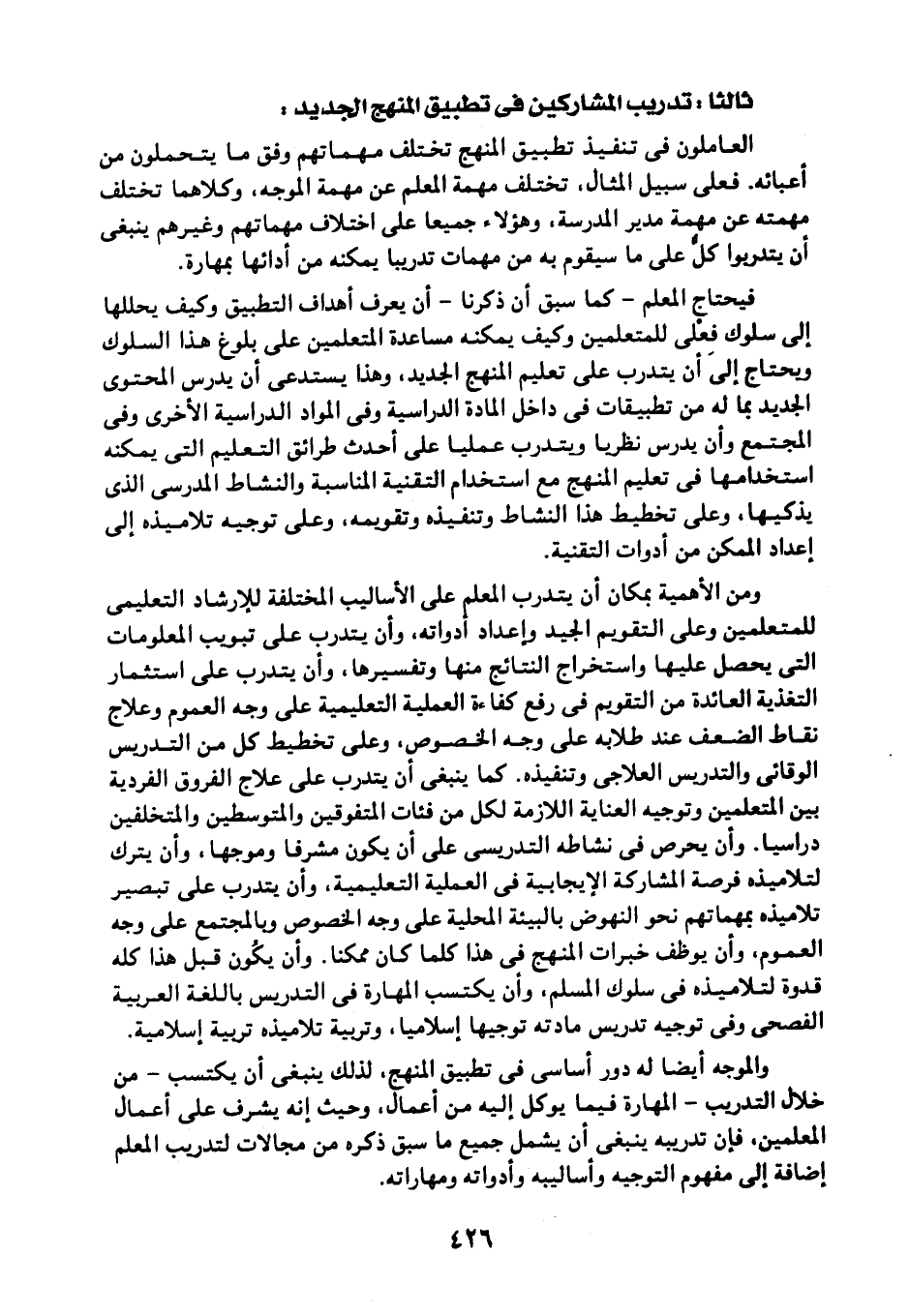 ومن الأهمية بمكان أن يتدرب المعلم على الأساليب المختلفة للإرشاد التعليمي للمتعلمين, وعلى التقويم الجيد وإعداد وأدواته، وأن يتدرب على تبويب المعلومات التي يحصل عليها, واستخراج النتائج منها وتفسيرها، وأن يتدرب عل استثمار التغذية العائدة من التقويم في رفع كفاءة العملية التعليمية على وجه العموم, وعلاج نقاط الضعف عند طلابه على وجه الخصوص، وعلى تخطيط كل من التدريس الوقائي والتدريس العلاجي وتنفيذه. كما ينبغي أن يتدرب على علاج الفروق الفردية بين المتعلمين وتوجيه العناية اللازمة لكل من فئات المتفوقين والمتوسطين والمتخلفين دراسيا. وأن يحرص في نشاطه التدريسي على أن يكون مشرفًا وموجهًا. وأن يترك لتلاميذه فرصة المشاركة الإيجابية في العملية التعليمية، وأن يتدرب على تبصير تلاميذه بمهماتهم نحو النهوض بالبيئة المحلية على وجه الخصوص وبالمجتمع على وجه العموم، وأن يوظف خبرات المنهج في هذا كلما كان ممكنا، وأن يكون قبل هذا كله قدوة لتلاميذه في سلوك المسلم، وأن يكتسب المهارة في التدريس باللغة العربية الفصحى, وفي توجيه تدريس مادته توجيهًا إسلاميا، وتربية تلاميذه تربية إسلامية.