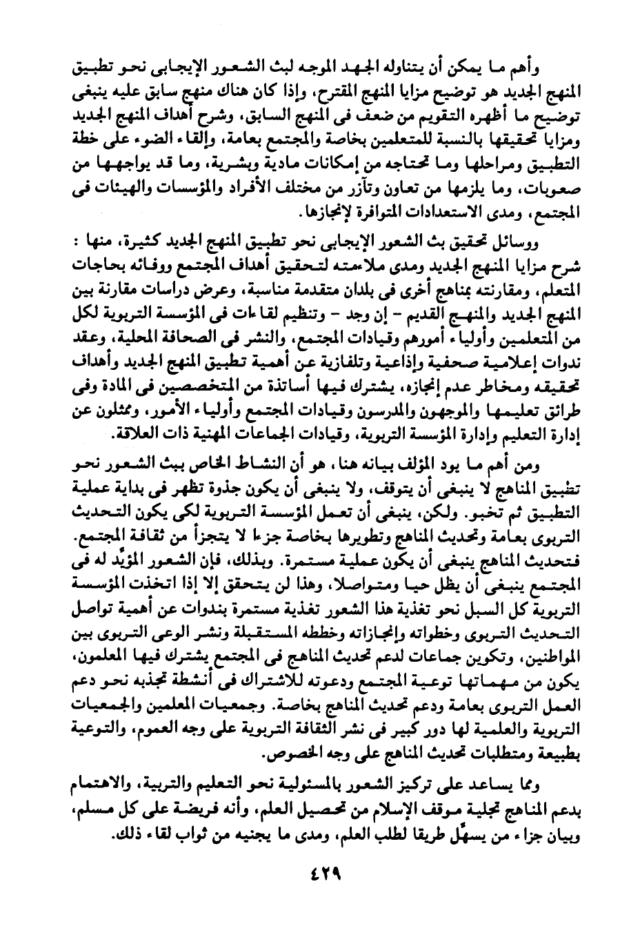 ومن أهم ما يود المؤلف بيانه هنا، هو أن النشاط الخاص ببث الشعور نحو تطبيق المناهج لا ينبغي أن يتوقف، ولا ينبغي أن يكون جذوة تظهر في بداية عملية التطبيق ثم تخبو. ولكن، ينبغي أن تعمل المؤسسة التربوية لكي يكون التحديث التربوي بعامة وتحديث المناهج وتطويرها بخاصة جزءا لا يتجزأ من ثقافة المجتمع.