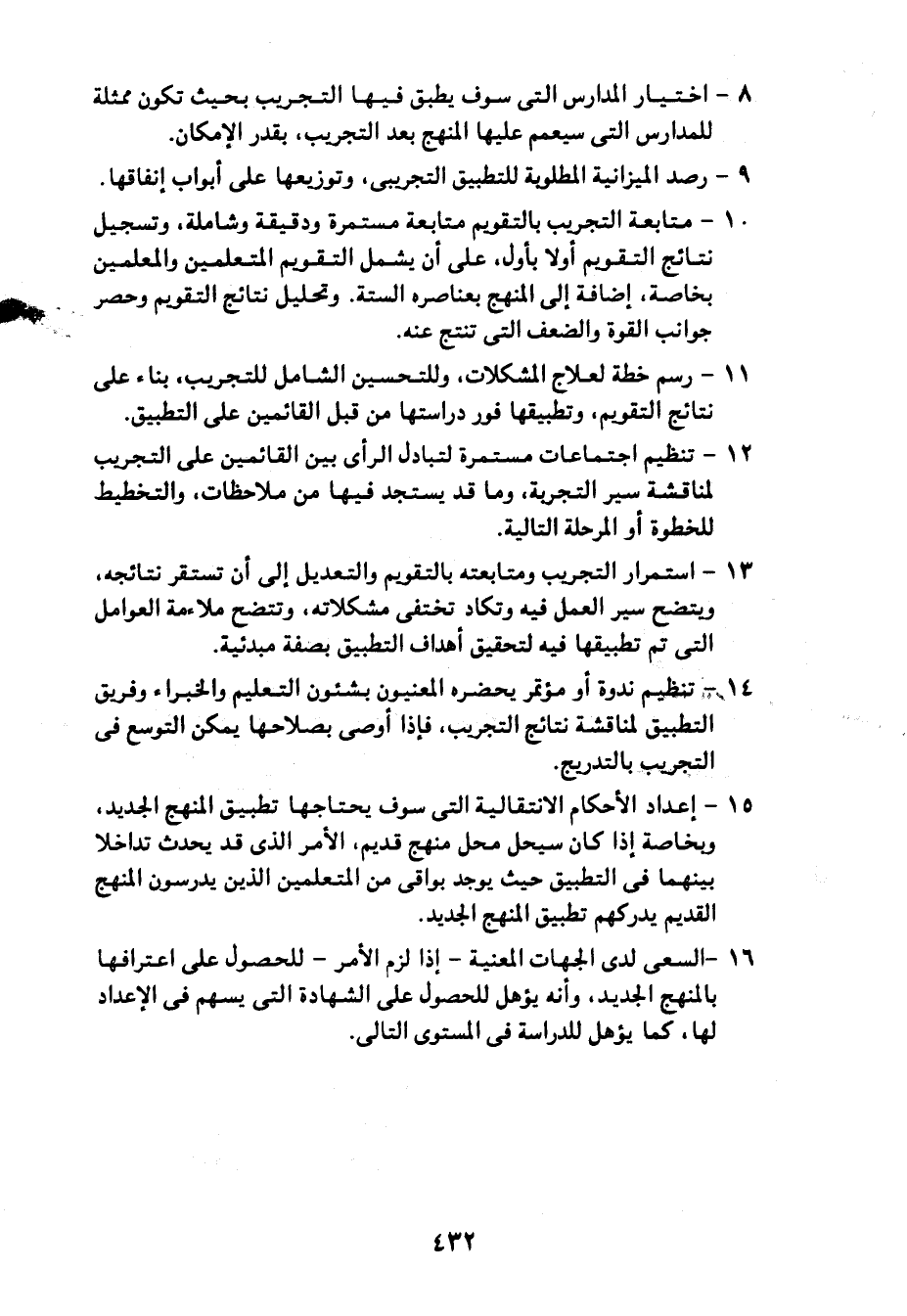 10- متابعة التجريب بالتقويم متابعة مستمرة ودقيقة وشاملة، وتسجيل نتائج التقويم أولا بأول، على أن يشمل التقويم المتعلمين والمعلمين بخاصة، إضافة إلى المنهج بعناصره الستة. وتحليل نتائج التقويم وحصر جوانب القوة والضعف التي تنتج عنه.