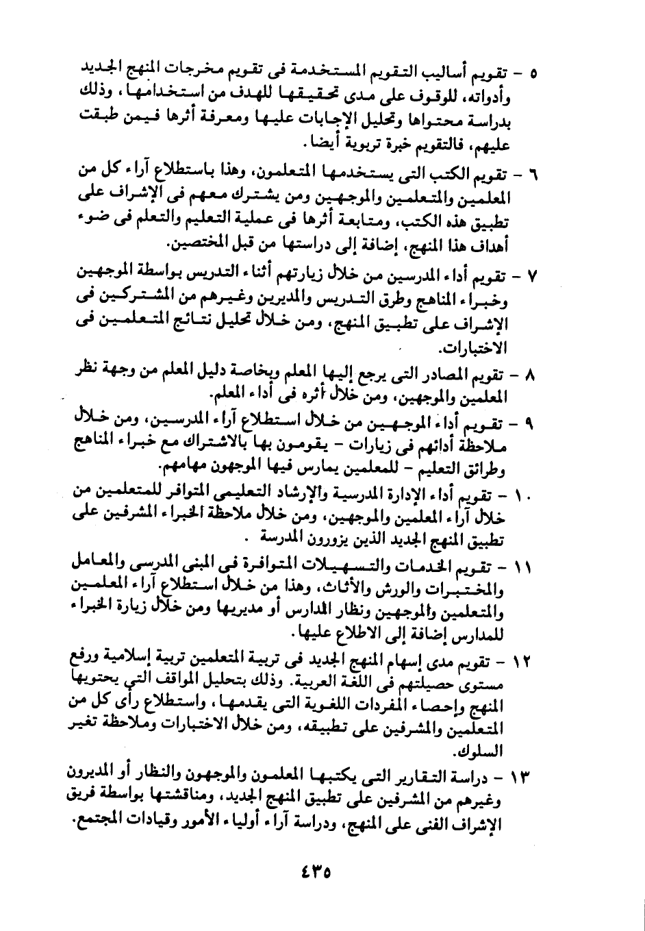 6- تقويم الكتب التي يستخدمها المتعلمون، وهذا باستطلاع آراء كل من المعلمين والمتعلمين والموجهين ومن يشترك معهم في الإشراف على تطبيق هذه الكتب، ومتابعة أثرها في عملية التعليم والتعلم في ضوء أهداف هذا المنهج، إضافة إلى دراستها من قبل المختصين.