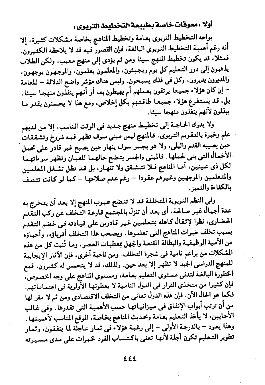 ولا يدرك الحاجة إلى تخطيط منهج جديد في الوقت المناسب، إلا من لديهم علم وخبرة بالتقويم التربوي. فالمنهج ليس مبنى سوف تظهر فيه شروخ وتشققات حين يصيبه القدم والبلى، ولا هو بجسر سوف ينهار حين يصبح غير قادر على تحمل الأحمال التي بني لحملها، فالمبنى والجسر يتضح حالهما للعيان وتظهر سوءاتهما لكل ذي عينين، أما المناهج لا تتشقق ولا تنهار، بل قد تظل تشغل المعلمين والمتعلمين والموجهين وغيرهم عقودًا -رغم عدم صلاحها- كما لو كانت تتصف بالكفاءة والتميز.