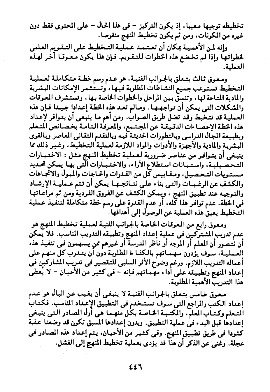 ومعوق ثالث يتعلق بالجوانب الفنية، هو عدم رسم خطة متكاملة لعملية التخطيط تستوعب جميع النشاطات المطلوبة فيها، وتستثمر الإمكانات البشرية والمادية المتاحة لها، وتنسق بين المراحل والخطوات الخاصة بها، وتستشرف المعوقات والمشكلات التي يمكن أن تواجهها، وما لم تعد هذه الخطة إعداد جيدًا فإن هذه العملية قد تتخبط وقد تضل طريق الصواب. ومن أهم ما ينبغي أن يتوافر لإعداد هذه الخطة الإحصاءات الدقيقة عن المجتمع، والمعرفة التامة بخصائص المتعلم وبطبيعة المجال الدراسي وبالتطورات الحديثة فيه وبالتقدم التقاني المعاصر, وبالقوى البشرية والمادية والأجهزة والأدوات والمواد اللازمة لعملية التخطيط، وغير ذلك مما ينبغي أن يتوافر من عناصر ضرورية لعملية تخطيط المنهج مثل: الاختبارات التحصيلية، واستبانات استطلاع الآراء. والاختبارات التي بها يمكن تحديد مستويات التحصيل، ومقاييس كل من القدرات والحاجات والميول والاتجاهات, والكشف عن الرغبات والتي بناء على نتائجها يمكن أن تتم عملية الإرشاد والتوجيه عند تطبيق المنهج، ويمكن الكشف عن الفروق الفردية ومن ثم مراعاتها في الخطة. عدم توافر هذا كله، أو عدم القدرة على رسم خطة متكاملة لتنفيذ عملية التخطيط يعيق هذه العملية عن الوصول إلى أهدافها.
