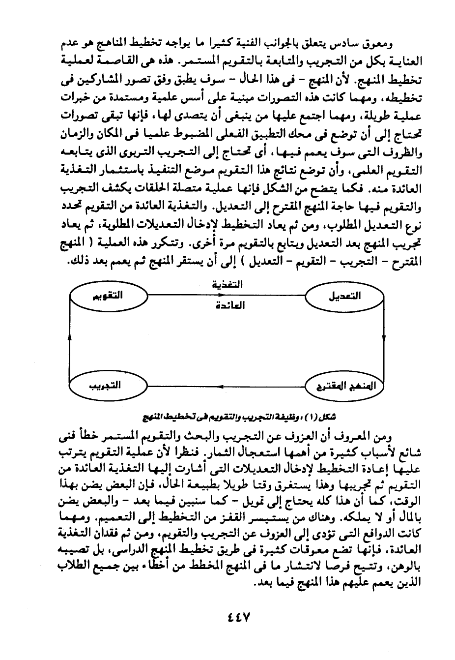 ومعوق سادس يتعلق بالجوانب الفنية, كثيرًا ما يواجه تخطيط المناهج هو عدم العناية بكل من التجريب والمتابعة بالتقويم المستمر. هذه هي القاصمة لعملية تخطيط المنهج؛ لأن المنهج -في هذا الحال- سوف يطبق وفق تصور المشاركين في تخطيطه. مهما كانت هذه التصورات مبنية على أسس علمية ومستمدة من خبرات عملية طويلة، ومهما اجتمع عليها من ينبغي أن يتصدى لها، فإنها تبقى تصورات تحتاج إلى أن توضح في محك التطبيق الفعلى المضبوط علميا في المكان والزمان والظروف التي سوف يعمم فيها، أي: تحتاج إلى التجريب التربوي الذي يتابعه التقويم العلمي، وأن توضع نتائج هذا التقويم موضع التنفيذ باستثمار التغذية العائدة منه. فكما يتضح من الشكل فإنها عملية متصلة الحلقات يكشف التجريب والتقويم فيها حاجة المنهج المقترح إلى التعديل. والتغذية العائدة من التقويم تحدد نوع التعديل المطلوب. ومن ثم يعاد التخطيط لإدخال التعديلات المطلوبة، ثم يعاد تجريب المنهج بعد التعديل ويتابع بالتقويم مرة أخرى. وتتكرر هذه العملية "المنهج المقترح -التجريب- التقويم -التعديل" إلى أن يستقر المنهج ثم يعمم بعد ذلك.