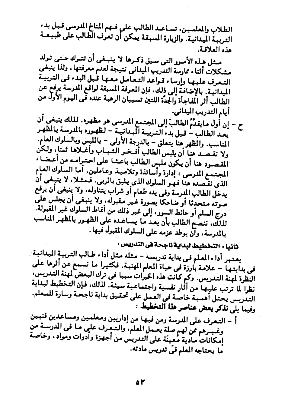 ح- أن أول ما يقدم الطالب إلى المجتمع المدرسي هو مظهره. لذلك ينبغي أن يعد الطالب -قبل بدء التربية الميدانية- لظهوره بالمدرسة بالمظهر المناسب. والمظهر هنا يتعلق -بالدرجة الأولى- بالملبس وبالسلوك العام.
