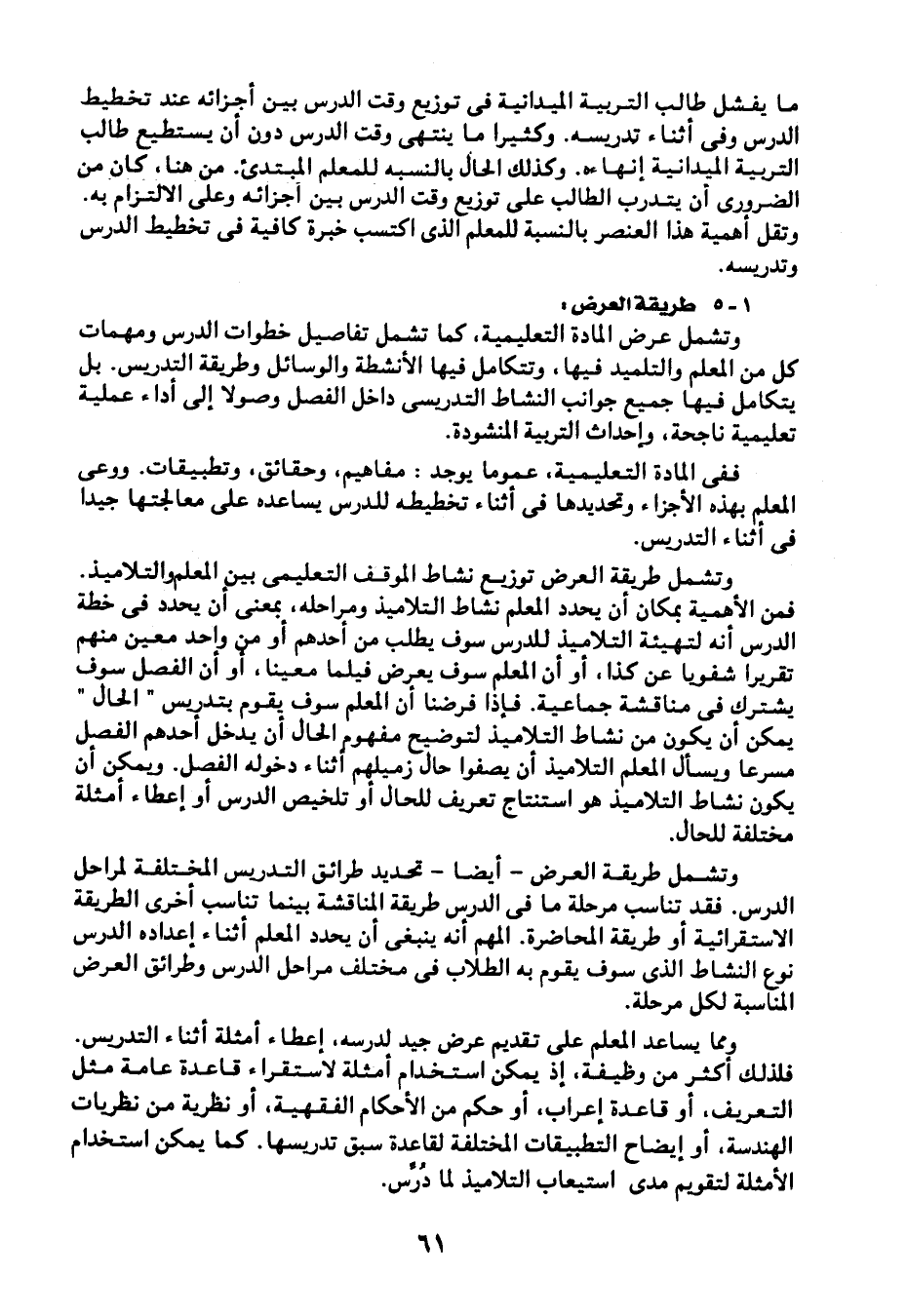 وتشمل طريقة العرض توزيع نشاط الموقف التعليمي بين المعلم والتلاميذ. فمن الأهمية بمكان أن يحدد المعلم نشاط التلاميذ ومراحله، بمعنى أن يحدد في خطة الدرس أنه لتهيئة التلاميذ للدرس سوف يطلب من أحدهم أو من واحد معين منهم تقريرًا شفويا عن كذا، أو أن المعلم سوف يعرض فيلما معينًا، أو أن الفصل سوف يشترك في مناقشة جماعية. فإذا فرضن أن المعلم سوف يقوم بتدريس "الحال" يمكن أن يكون من نشاط التلاميذ لتوضيح مفهوم الحال أن يدخل أحدهم الفصل مسرعًا ويسأل المعلم التلاميذ أن يصفوا حال زميلهم أثناء دخوله الفصل، ويمكن أن يكون نشاط التلاميذ هو استنتاج تعريف للحال أو تلخيص الدرس أو إعطاء أمثلة مختلفة للحال.