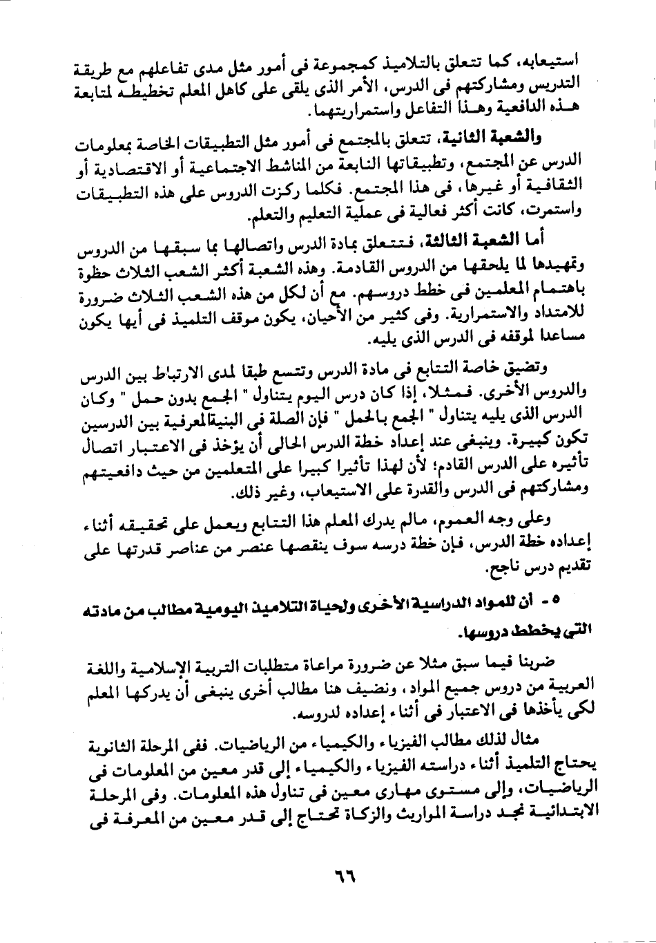 5- أن للمواد الدراسية الأخرى ولحياة التلاميذ اليومية مطالب من مادته التي يخطط دروسها: