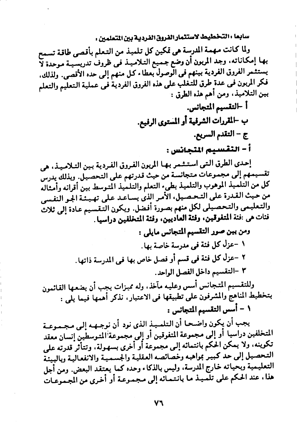 إحدى الطرق التى استثمر بها المربون الفروق الفردية بين التلاميذ، هي تقسيمهم إلى مجموعات متجانسة من حيث قدرتهم على التحصيل، وبذلك يدرس كل من التلميذ الموهوب، والتلميذ بطيء التعلم والتلميذ المتوسط بين أقرانه وأمثاله من حيث القدرة على التحصيل، الأمر الذي يساعد على تهيئة الجو النفسي والتعليمي والتحصيلي لكل منهم بصورة أفضل. ويكون التقسيم عادة إلى ثلاث فئات هي: فئة المتفوفين، وفئة العاديين، وفئة المتخلفين دراسيا.