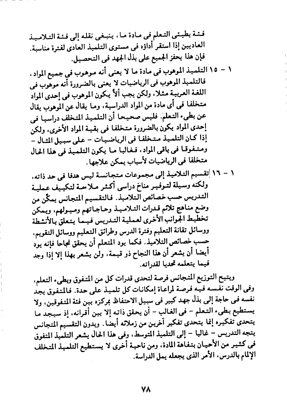 15- التلميذ الموهوب في مادة ما لا يعني أنه موهوب في جميع المواد. فالتلميذ الموهوب في الرياضيات لا يعني بالضرورة أنه موهوب في اللغة العربية مثلًا، ولكن يجب ألا يكون الموهوب في إحدى المواد متخلفًا في أي مادة من المواد الدراسية. وما يقال عن الموهوب يقال عن بطيء التعلم. فليس صحيحًا أن التلميذ المتخلف دراسيا في إحدى المواد يكون بالضرورة متخلفًا في بقية المواد الأخرى، ولكن إذا كان التلميذ متخلفًا في الرياضيات -على سبيل المثال- ومتفوقًا في باقي المواد، فغالبًا ما يكون التلميذ في هذا الحال متخلفًا في الرياضيات لأسباب يمكن علاجها.