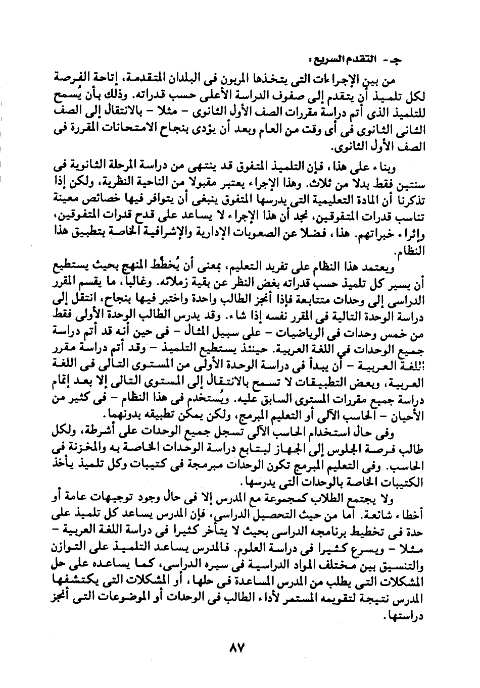 من بين الإجراءات التي يتخذها المربون في البلدان المتقدمة، إتاحة الفرصة لكل تلميذ أن يتقدم إلى صفوف الدراسة الأعلى حسب قدراته. وذلك بأن يسمح للتلميذ الذي أتم دراسة مقررات الصفة الأول الثانوي -مثلًا- بالانتقال إلى الصف الثاني الثانوي في أي وقت من العام وبعد أن يؤدي بنجاح الامتحانات المقررة في الصف الأول الثانوي.