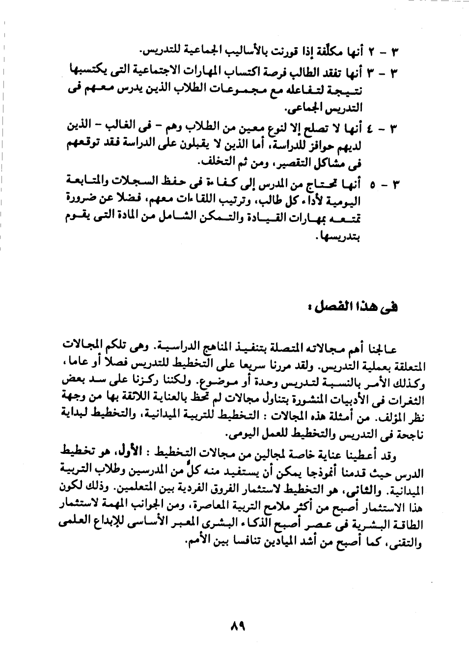وقد أعطينا عناية خاصة لمجالين من مجالات التخطيط: الأول, هو تخطيط الدرس, حيث قدمنا أنموذجًا يمكن أن يستفيد منه كل من المدرسين وطلاب التربية الميدانية، والثاني، هو التخطيط لاستثمار الفروق الفردية بين المتعلمين. وذلك لكون هذا الاستثمار أصبح من أكثر ملامح التربية المعاصرة، ومن الجوانب المهمة لاستثمار الطاقة البشرية في عصر أصبح الذكاء البشري المعبر الأساسي للإبداع العلمي والتقني، كما أصبح من أشد الميادين تنافسًا بين الأمم.