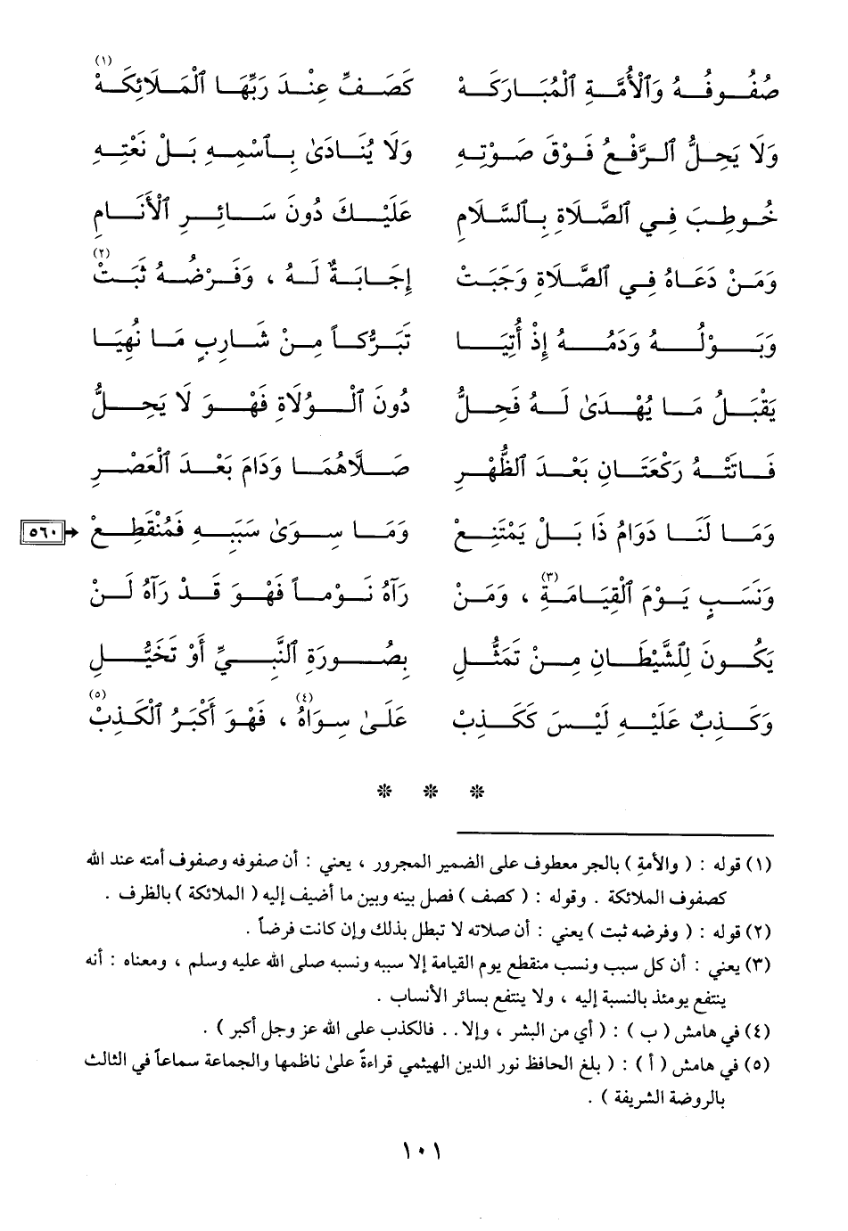 صُفُوفُهُ والأمَّةِ المُبَارَكَهْ ... كَصَفّ عِندَ رَبّهَا المَلائِكهْ «1»
