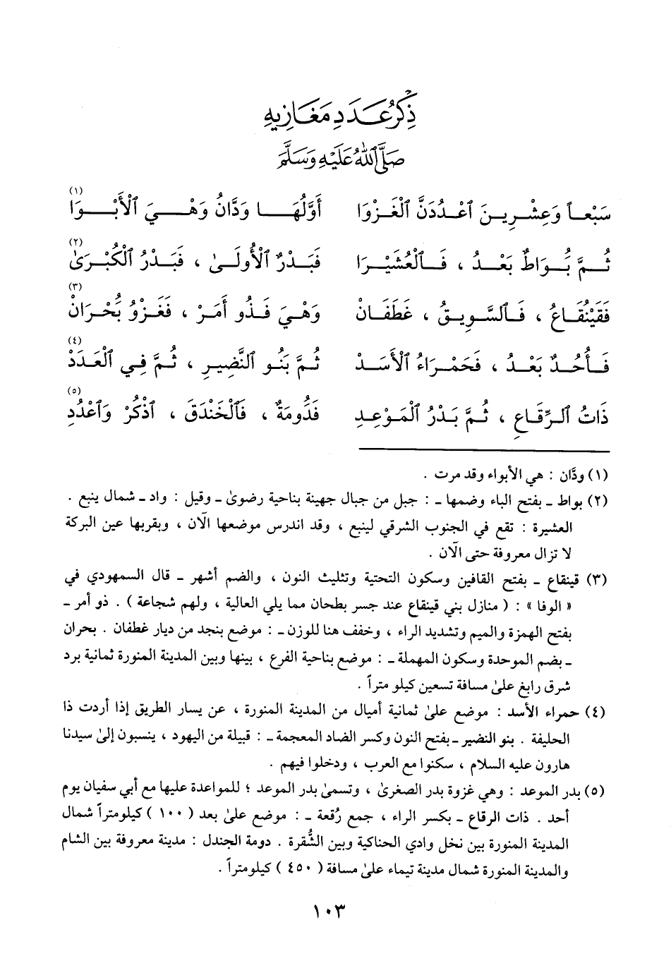 (5) بدر الموعد: وهي غزوة بدر الصغرى، وتسمى بدر الموعد؛ للمواعدة عليها مع أبي سفيان يوم أحد. ذات الرقاع- بكسر الراء، جمع رقعة-: موضع على بعد (100) كيلومترا شمال المدينة المنورة بين نخل وادي الحناكية وبين الشّقرة. دومة الجندل: مدينة معروفة بين الشام والمدينة المنورة شمال مدينة تيماء على مسافة (450) كيلومترا.