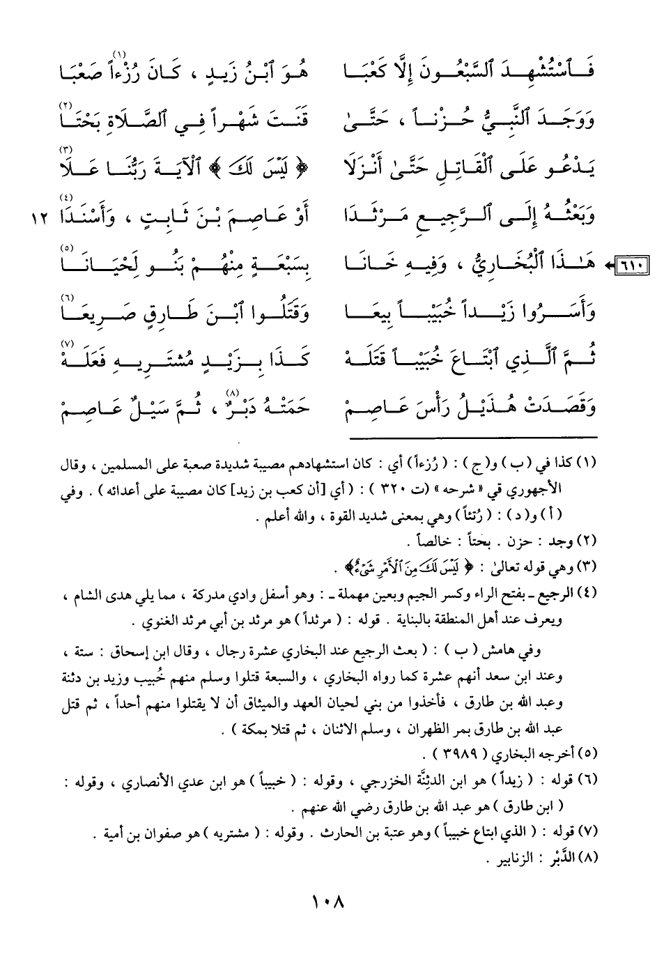 (6) قوله: (زيدا) هو ابن الدثنّة الخزرجي، وقوله: (خبيبا) هو ابن عدي الأنصاري، وقوله: (ابن طارق) هو عبد الله بن طارق رضي الله عنهم.