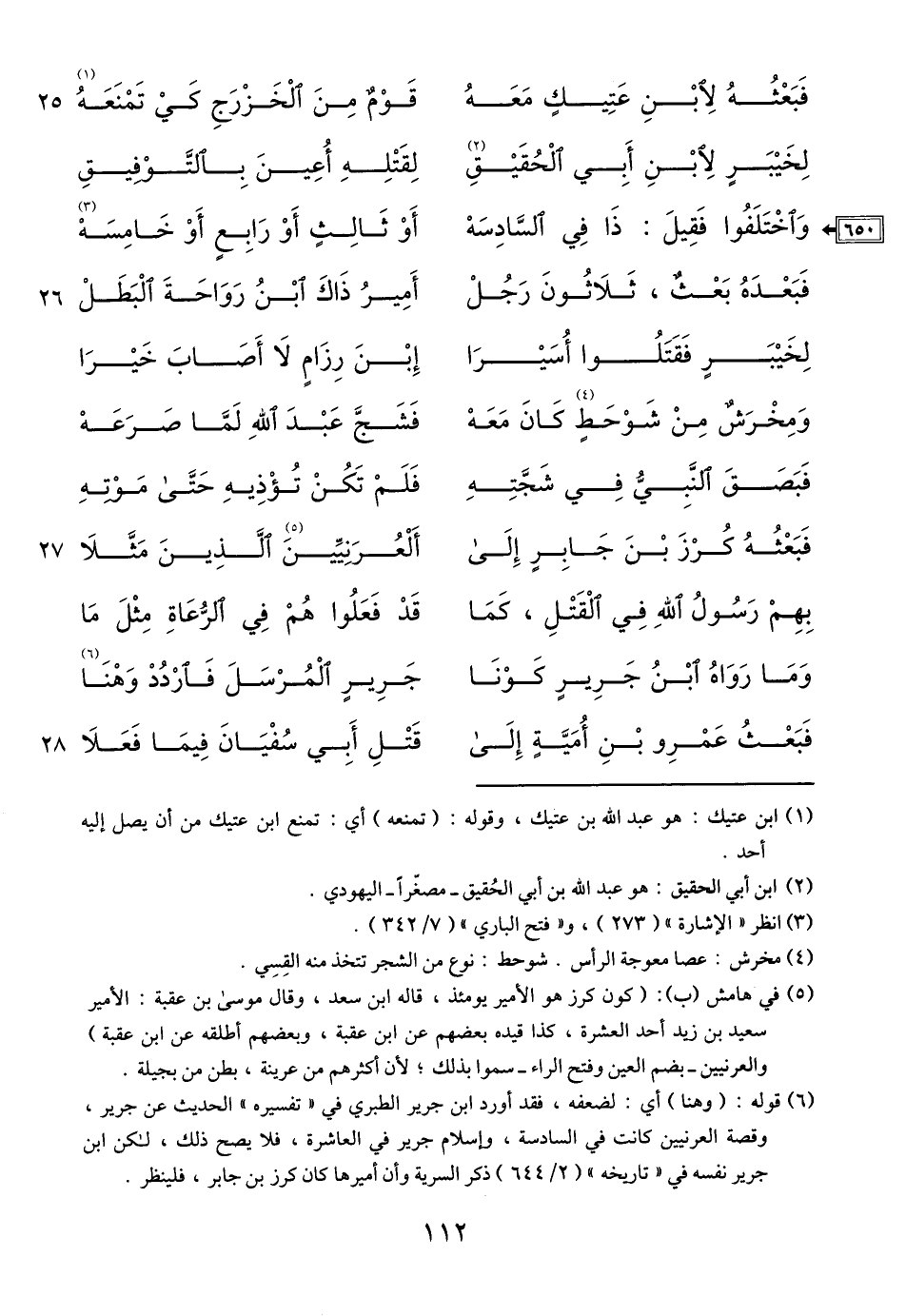 (6) قوله: (وهنا) أي: لضعفه، فقد أورد ابن جرير الطبري في «تفسيره» الحديث عن جرير، وقصة العرنيين كانت في السادسة، وإسلام جرير في العاشرة، فلا يصح ذلك، لكن ابن جرير نفسه في «تاريخه» (2/ 644) ذكر السرية وأن أميرها كان كرز بن جابر، فلينظر.