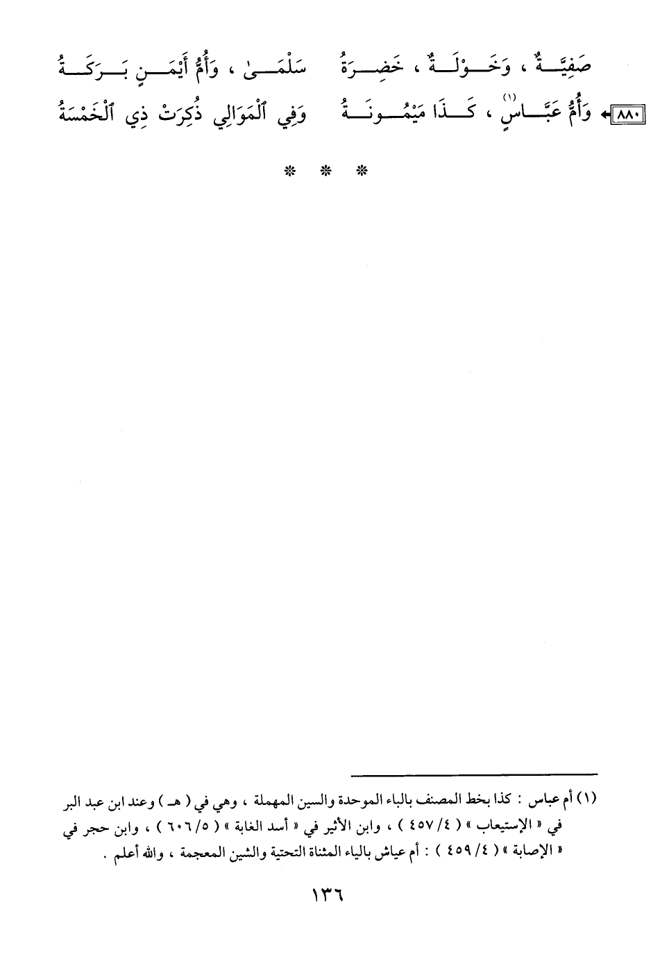 (1) أم عباس: كذا بخط المصنف بالباء الموحدة والسين المهملة، وهي في (هـ) وعند ابن عبد البر في «الإستيعاب» (4/ 457) ، وابن الأثير في «أسد الغابة» (5/ 606) ، وابن حجر في «الإصابة» (4/ 459) : أم عياش بالياء المثناة التحتية والشين المعجمة، والله أعلم.
