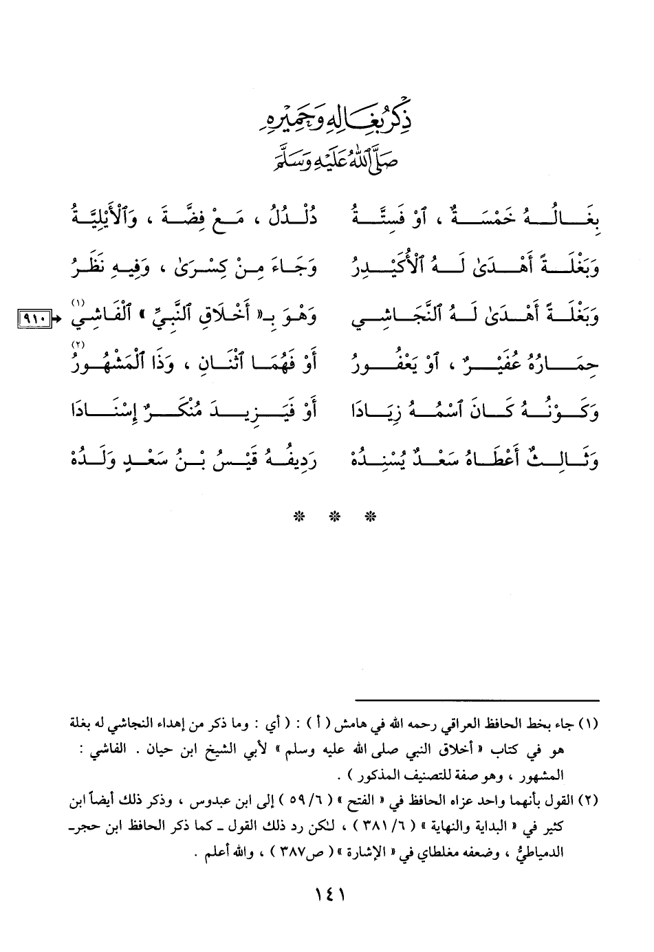 (1) جاء بخط الحافظ العراقي رحمه الله في هامش (أ) : (أي: وما ذكر من إهداء النجاشي له بغلة هو في كتاب «أخلاق النبي صلى الله عليه وسلم» لأبي الشيخ ابن حيان. الفاشي: المشهور، وهو صفة للتصنيف المذكور) .
