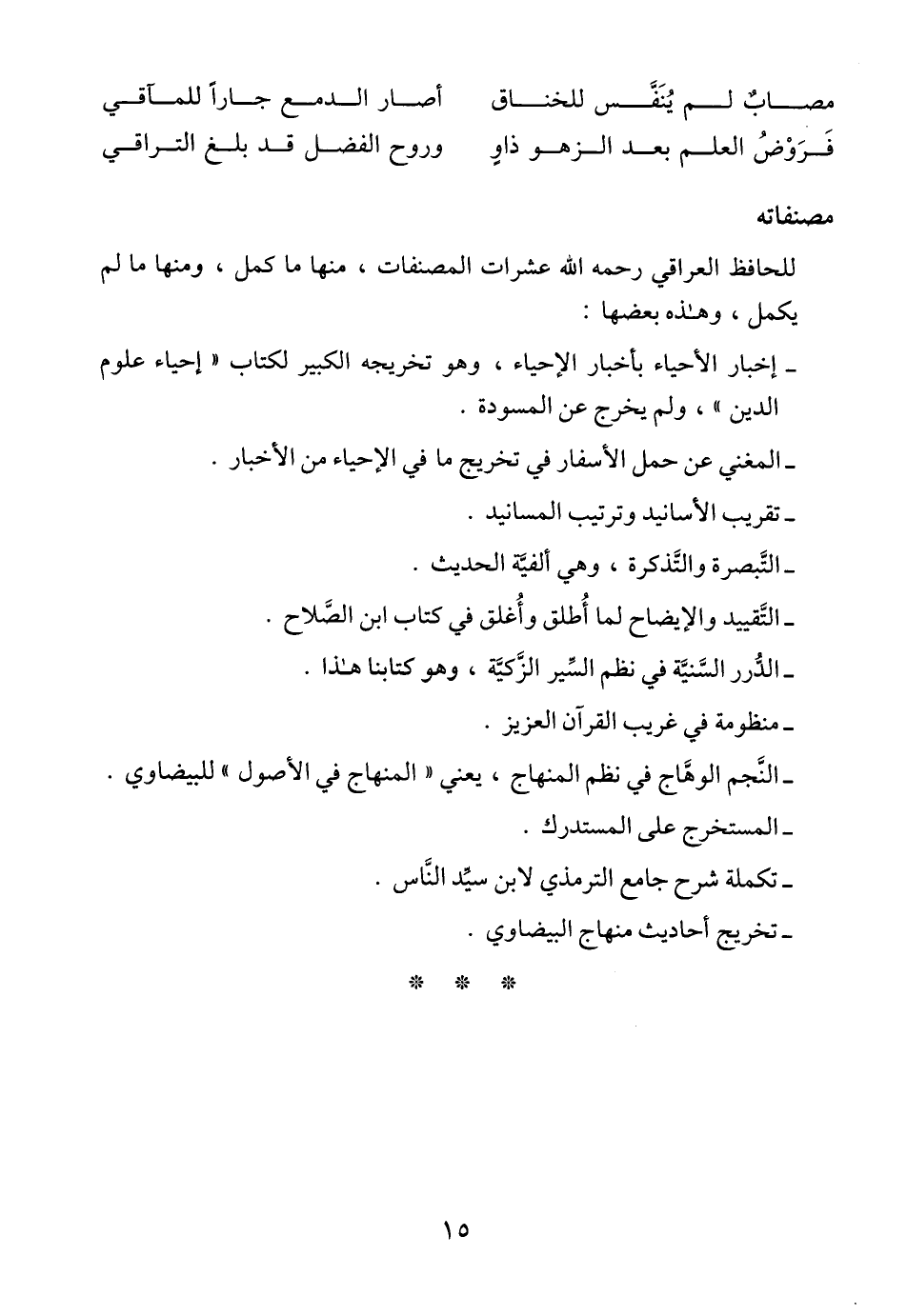 للحافظ العراقي رحمه الله عشرات المصنفات، منها ما كمل، ومنها ما لم يكمل، وهذه بعضها: