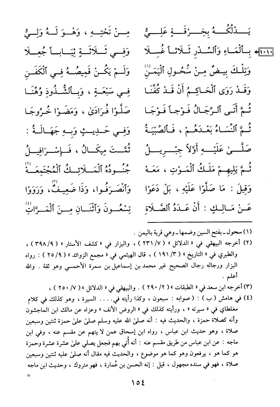 (4) في هامش (ب) : (صوابه: سبعون، وكذا رأيته في ... السيرة، وهو كذلك في كلام مغلطاي في «سيرته» ، ورأيته كذلك في «الروض الأنف» وعزاه عن مالك ابن الماجشون وأنه كصلاة حمزة، والحديث فيه: أنه ص صلى على حمزة ثنتين وسبعين صلاة، وهو حديث ابن عباس، رواه ابن إسحاق عمن لا يتهم عن مقسم عنه، وفي ابن ماجه: عن ابن عباس من طريق مقسم عنه: أنه أتي بهم فجعل يصلي على عشرة عشرة وحمزة هو كما هو، يرفعون وهو كما هو موضوع، والحديث فيه مقال أنه صلى عليه ثنتين وسبعين صلاة، فهو في سنده مجهول، قيل: إنه الحسن بن عمارة، فهو متروك، وحديث ابن ماجه