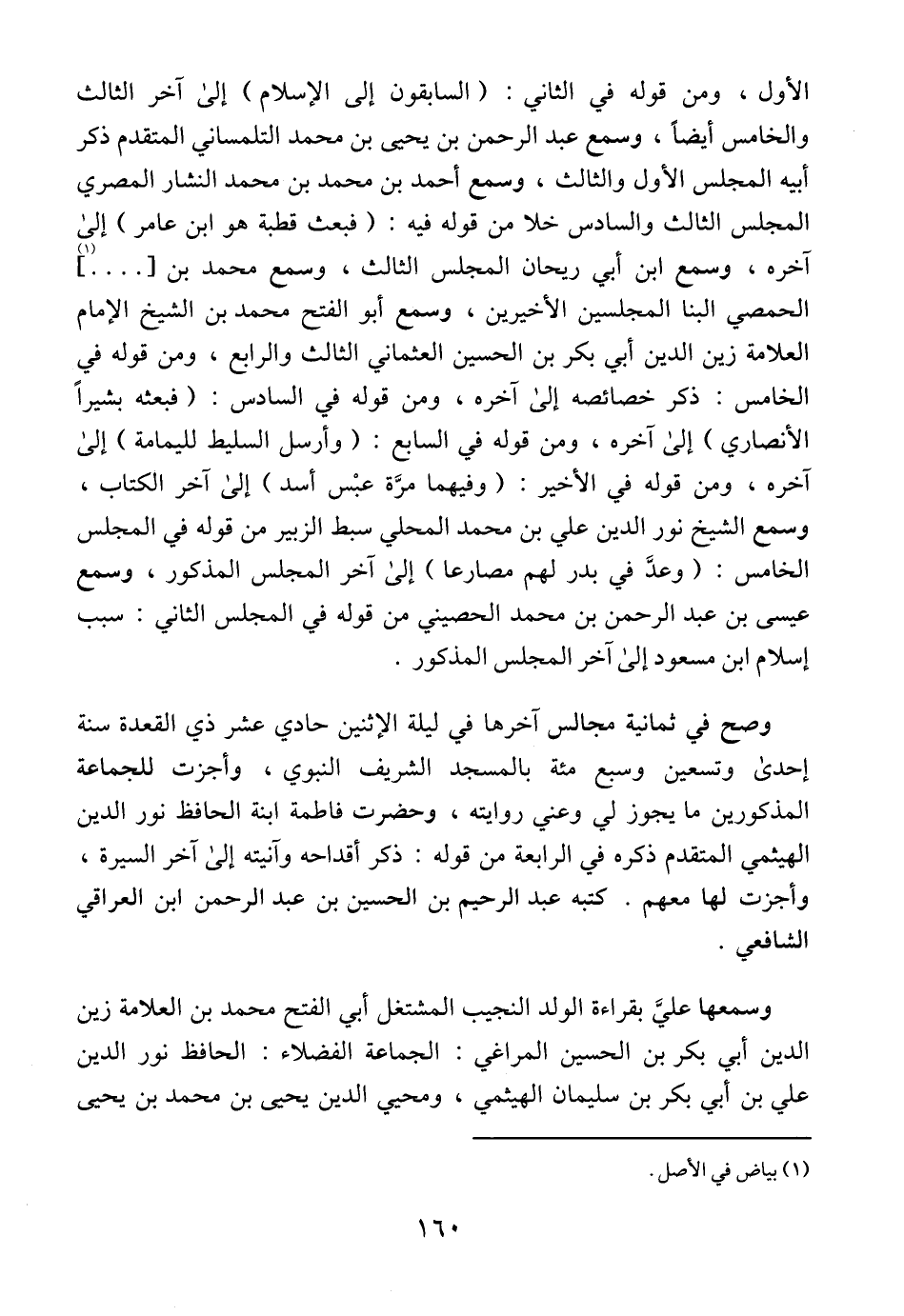 وصح في ثمانية مجالس آخرها في ليلة الإثنين حادي عشر ذي القعدة سنة إحدى وتسعين وسبع مئة بالمسجد الشريف النبوي، وأجزت للجماعة المذكورين ما يجوز لي وعني روايته، وحضرت فاطمة ابنة الحافظ نور الدين الهيثمي المتقدم ذكره في الرابعة من قوله: ذكر أقداحه وآنيته إلى آخر السيرة، وأجزت لها معهم. كتبه عبد الرحيم بن الحسين بن عبد الرحمن ابن العراقي الشافعي.