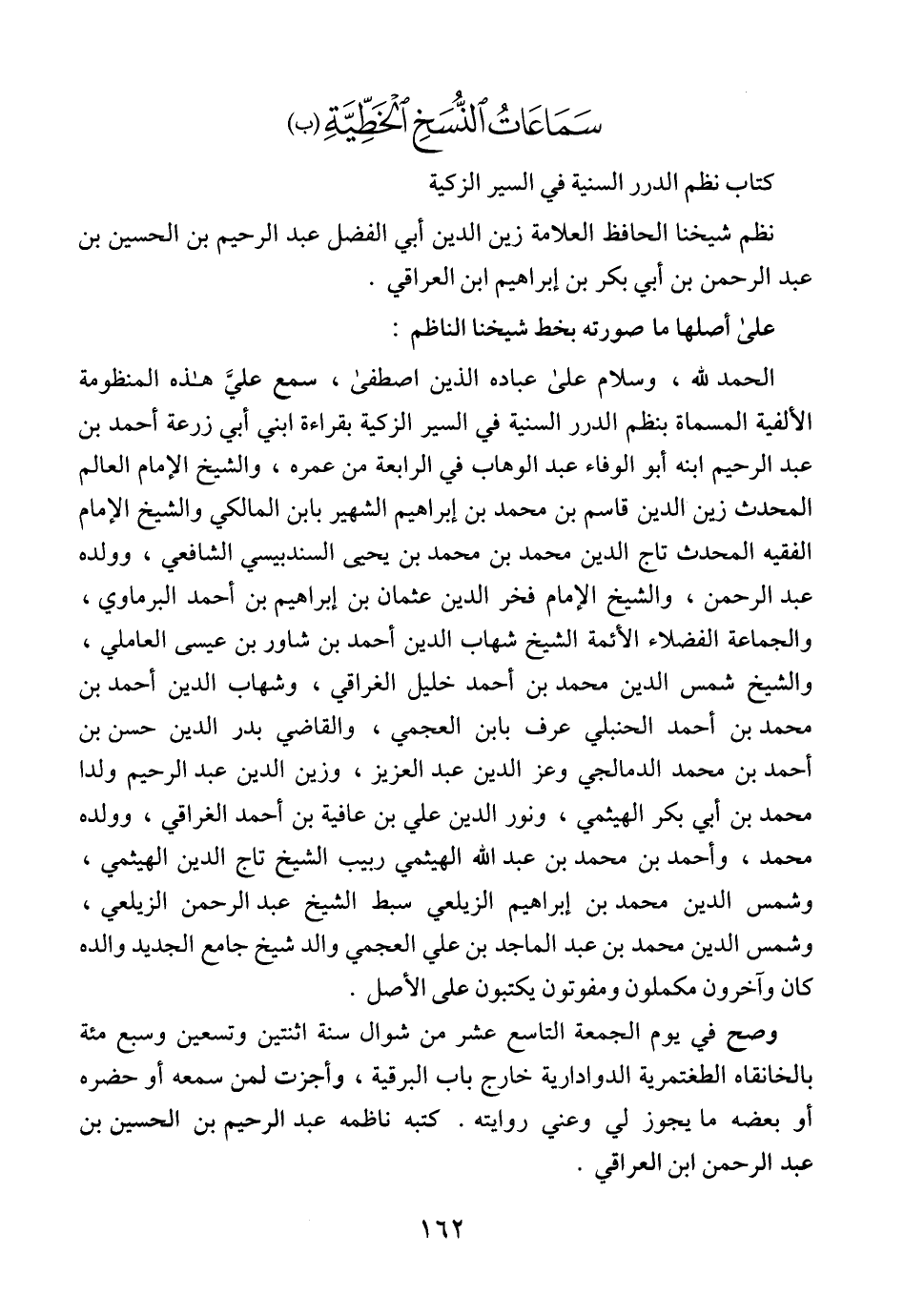 الحمد لله، وسلام على عباده الذين اصطفى، سمع عليّ هذه المنظومة الألفية المسماة بنظم الدرر السنية في السير الزكية بقراءة ابني أبي زرعة أحمد بن عبد الرحيم ابنه أبو الوفاء عبد الوهاب في الرابعة من عمره، والشيخ الإمام العالم المحدث زين الدين قاسم بن محمد بن إبراهيم الشهير بابن المالكي والشيخ الإمام الفقيه المحدث تاج الدين محمد بن محمد بن يحيى السندبيسي الشافعي، وولده عبد الرحمن، والشيخ الإمام فخر الدين عثمان بن إبراهيم بن أحمد البرماوي، والجماعة الفضلاء الأئمة الشيخ شهاب الدين أحمد بن شاور بن عيسى العاملي، والشيخ شمس الدين محمد بن أحمد خليل الغراقي، وشهاب الدين أحمد بن محمد بن أحمد الحنبلي عرف بابن العجمي، والقاضي بدر الدين حسن بن أحمد بن محمد الدمالجي وعز الدين عبد العزيز، وزين الدين عبد الرحيم ولدا محمد بن أبي بكر الهيثمي، ونور الدين علي بن عافية بن أحمد الغراقي، وولده محمد، وأحمد بن محمد بن عبد الله الهيثمي ربيب الشيخ تاج الدين الهيثمي، وشمس الدين محمد بن إبراهيم الزيلعي سبط الشيخ عبد الرحمن الزيلعي، وشمس الدين محمد بن عبد الماجد بن علي العجمي والد شيخ جامع الجديد والده كان وآخرون مكملون ومفوتون يكتبون على الأصل.