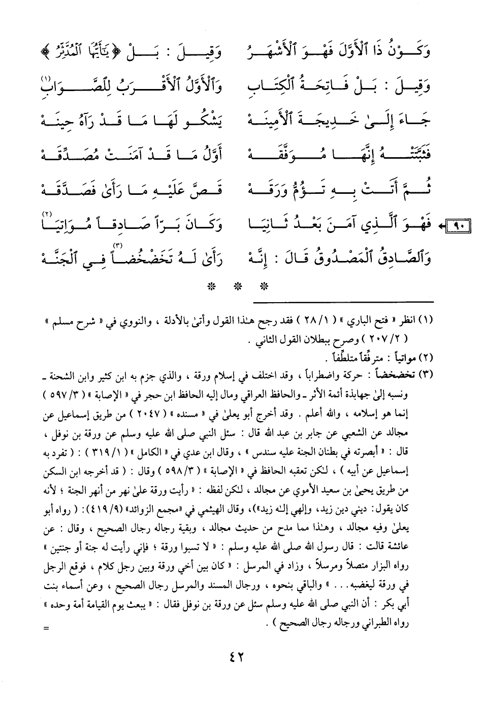 (3) تخضخضا: حركة واضطرابا، وقد اختلف في إسلام ورقة، والذي جزم به ابن كثير وابن الشحنة- ونسبه إلى جهابذة أئمة الأثر- والحافظ العراقي ومال إليه الحافظ ابن حجر في «الإصابة» (3/ 597) إنما هو إسلامه، والله أعلم. وقد أخرج أبو يعلى في «مسنده» (2047) من طريق إسماعيل عن مجالد عن الشعبي عن جابر بن عبد الله قال: سئل النبي ص عن ورقة بن نوفل، قال: «أبصرته في بطنان الجنة عليه سندس» ، وقال ابن عدي في «الكامل» (1/ 319) : (تفرد به إسماعيل عن أبيه) ، لكن تعقبه الحافظ في «الإصابة» (3/ 598) وقال: (قد أخرجه ابن السكن من طريق يحيى بن سعيد الأموي عن مجالد، لكن لفظه: «رأيت ورقة على نهر من أنهر الجنة؛ لأنه كان يقول: ديني دين زيد، وإلهي إله زيد» ) ، وقال الهيثمي في «مجمع الزوائد» (9/ 419) : (رواه أبو يعلى وفيه مجالد، وهذا مما مدح من حديث مجالد، وبقية رجاله رجال الصحيح، وقال: عن عائشة قالت: قال رسول الله صلى الله عليه وسلم: «لا تسبوا ورقة؛ فإني رأيت له جنة أو جنتين» رواه البزار متصلا ومرسلا، وزاد في المرسل: «كان بين أخي ورقة وبين رجل كلام، فوقع الرجل في ورقة ليغضبه ... » والباقي بنحوه، ورجال المسند والمرسل رجال الصحيح، وعن أسماء بنت أبي بكر: أن النبي ص سئل عن ورقة بن نوفل فقال: «يبعث يوم القيامة أمة وحده» رواه الطبراني ورجاله رجال الصحيح) .