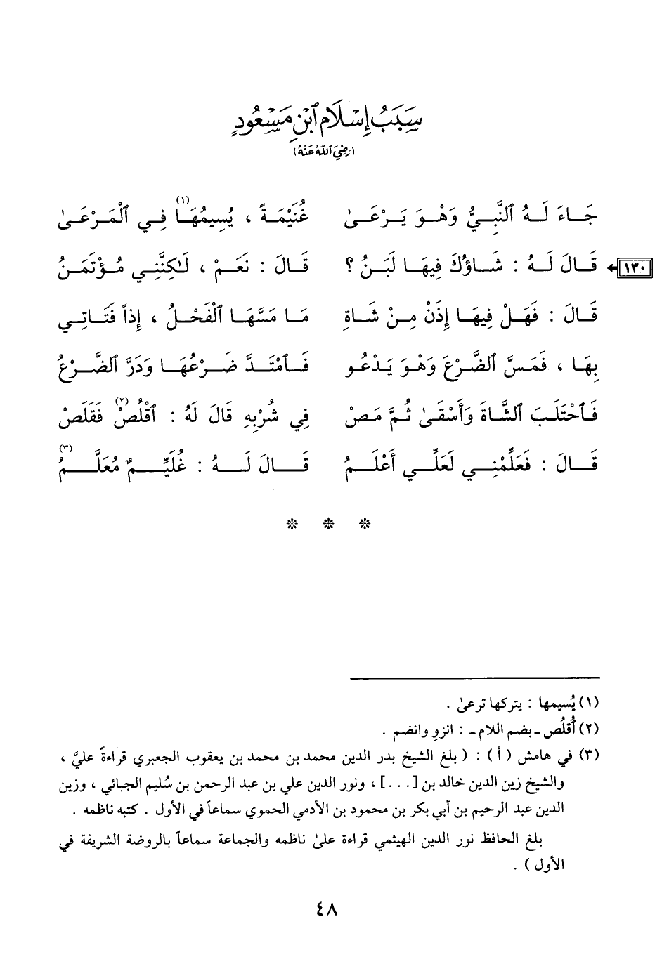 جاءَ لهُ النبيُّ وهْوَ يَرْعى ... غُنَيْمةً، يُسيمُها «1» في المرعَى