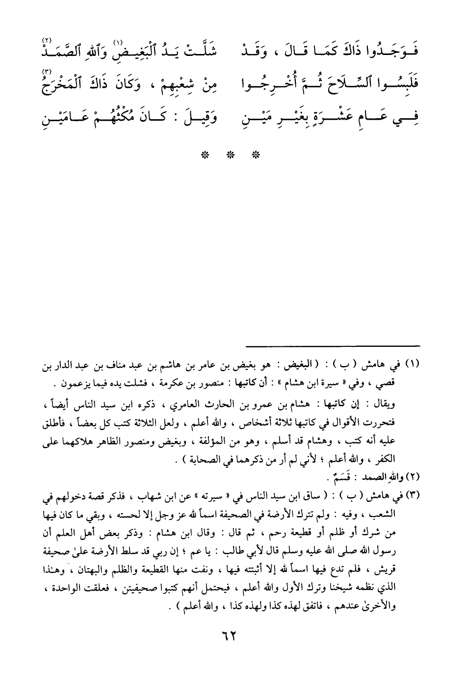 (1) في هامش (ب) : (البغيض: هو بغيض بن عامر بن هاشم بن عبد مناف بن عبد الدار بن قصي، وفي «سيرة ابن هشام» : أن كاتبها: منصور بن عكرمة، فشلت يده فيما يزعمون. ويقال: إن كاتبها: هشام بن عمرو بن الحارث العامري، ذكره ابن سيد الناس أيضا، فتحررت الأقوال في كاتبها ثلاثة أشخاص، والله أعلم، ولعل الثلاثة كتب كل بعضا، فأطلق عليه أنه كتب، وهشام قد أسلم، وهو من المؤلفة، وبغيض ومنصور الظاهر هلاكهما على الكفر، والله أعلم، لأني لم أر من ذكرهما في الصحابة) .