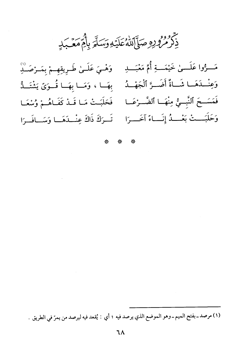 مَرُّوا على خَيمَةِ أمِ مَعبَدِ ... وهْيَ علَى طريقِهِمْ بمَرْصَدِ»