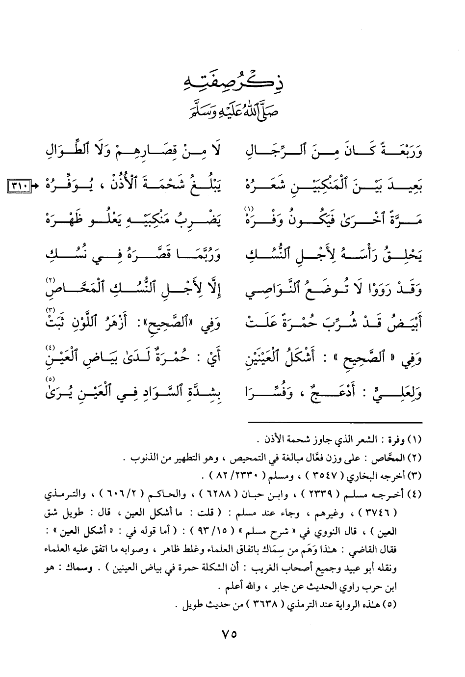 (4) أخرجه مسلم (2339) ، وابن حبان (6288) ، والحاكم (2/ 606) ، والترمذي (3746) ، وغيرهم، وجاء عند مسلم: (قلت: ما أشكل العين، قال: طويل شق العين) ، قال النووي في «شرح مسلم» (15/ 93) : (أما قوله في: «أشكل العين» : فقال القاضي: هذا وهم من سماك باتفاق العلماء وغلط ظاهر، وصوابه ما اتفق عليه العلماء ونقله أبو عبيد وجميع أصحاب الغريب: أن الشكلة حمرة في بياض العينين) . وسماك: هو ابن حرب راوي الحديث عن جابر، والله أعلم.