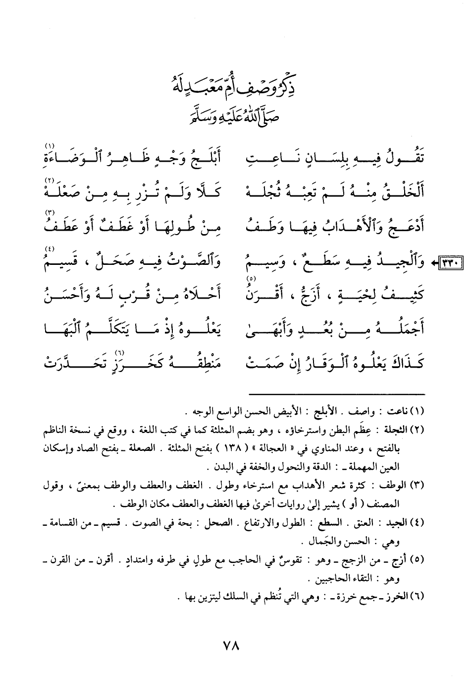 (4) الجيد: العنق. السطع: الطول والارتفاع. الصحل: بحة في الصوت. قسيم- من القسامة- وهي: الحسن والجمال.