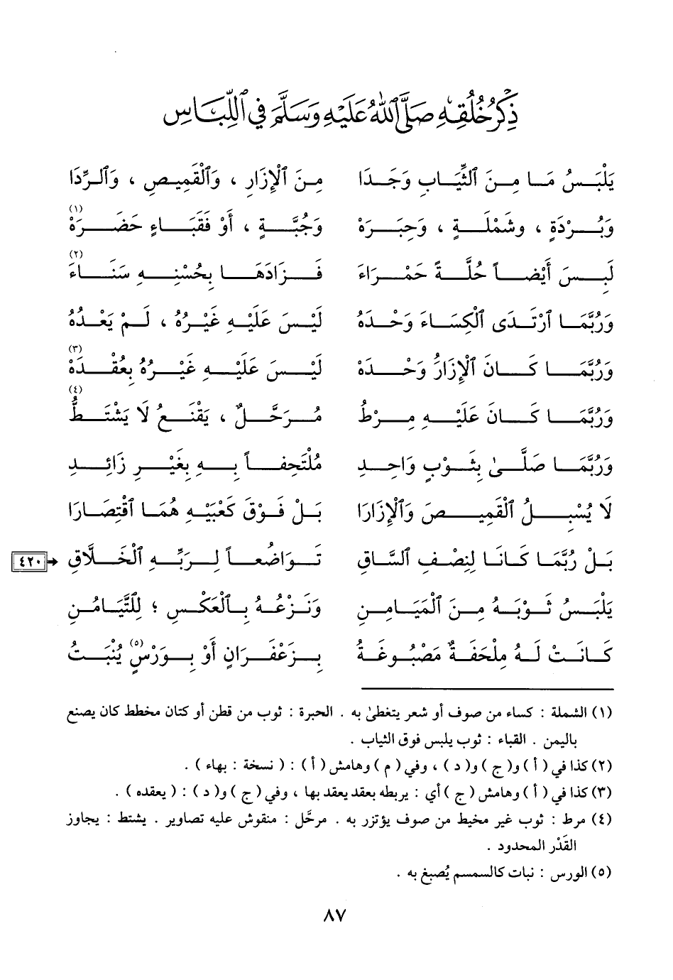 (1) الشملة: كساء من صوف أو شعر يتغطى به. الحبرة: ثوب من قطن أو كتان مخطط كان يصنع باليمن. القباء: ثوب يلبس فوق الثياب.