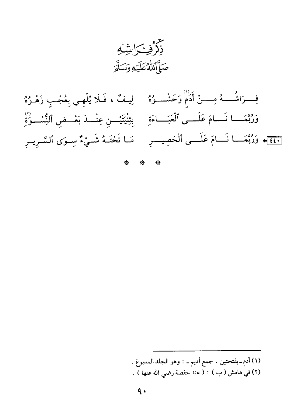 وربَّما نَامَ على العَبَاءةِ ... بثَنْيَتَينِ عِندَ بعضِ النّسْوةِ «2»
