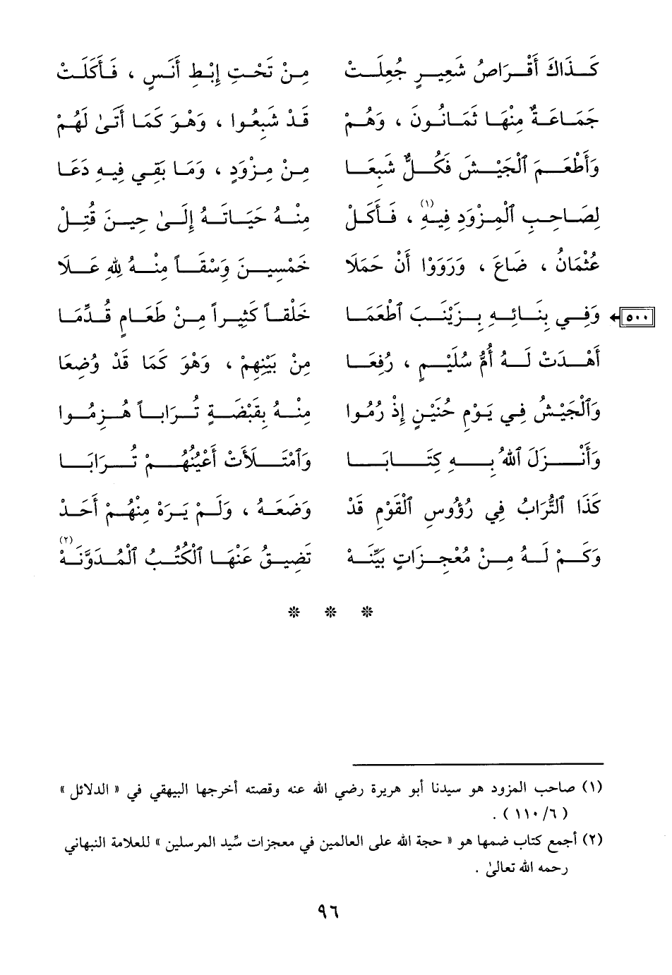 وكمْ لهُ مِنْ مُعجزاتٍ بَيّنَهْ ... تَضيقُ عَنهَا الكتب المدوّنه «2»