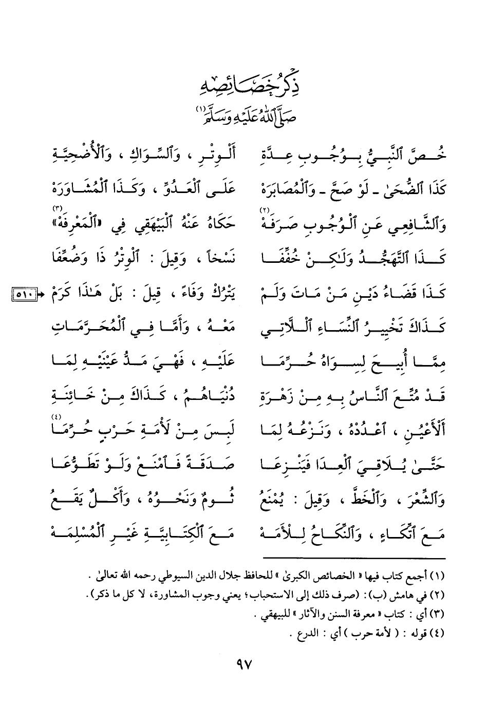 خُصَّ النبيُّ بوجوبِ عِدَّهْ ... الوِتْرِ، والسّوَاكِ، والأُضْحِيَّهْ