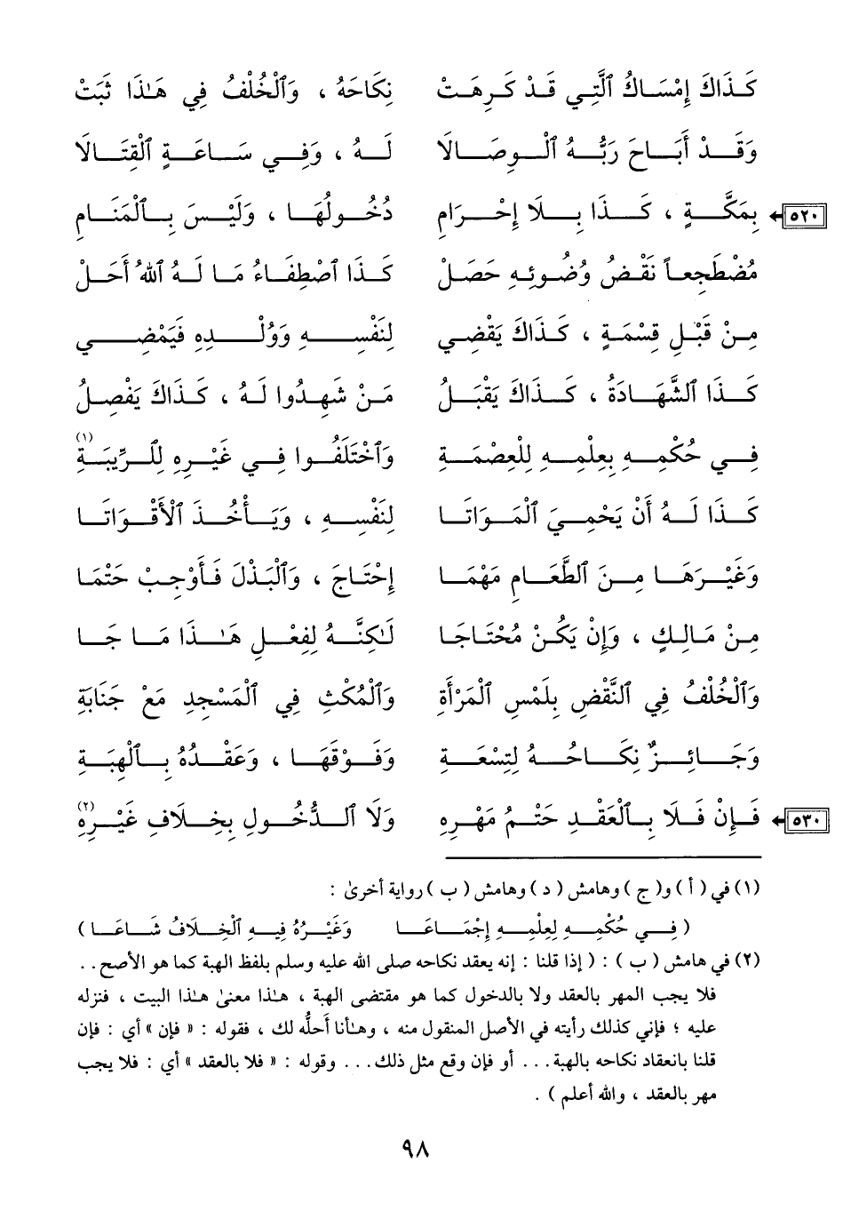 (2) في هامش (ب) : (إذا قلنا: إنه يعقد نكاحه ص بلفظ الهبة كما هو الأصح.. فلا يجب المهر بالعقد ولا بالدخول كما هو مقتضى الهبة، هذا معنى هذا البيت، فنزله عليه؛ فإني كذلك رأيته في الأصل المنقول منه، وهأنا أحلّه لك، فقوله: «فإن» أي: فإن قلنا بانعقاد نكاحه بالهبة ... أو فإن وقع مثل ذلك ... وقوله: «فلا بالعقد» أي: فلا يجب مهر بالعقد، والله أعلم) .