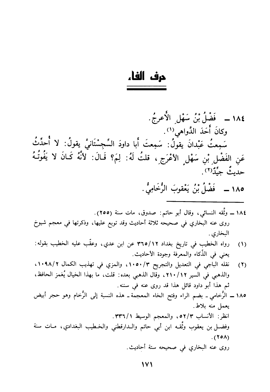 سَمِعت عَبْدَانِ يَقُول سَمِعت أَبَا دَاوُد السجسْتانِي يَقُول لَا أحدث عَن الْفضل بن سهل الْأَعْرَج قلت لَهُ لم قَالَ لِأَنَّهُ كَانَ لَا يفوتهُ حَدِيث جيد