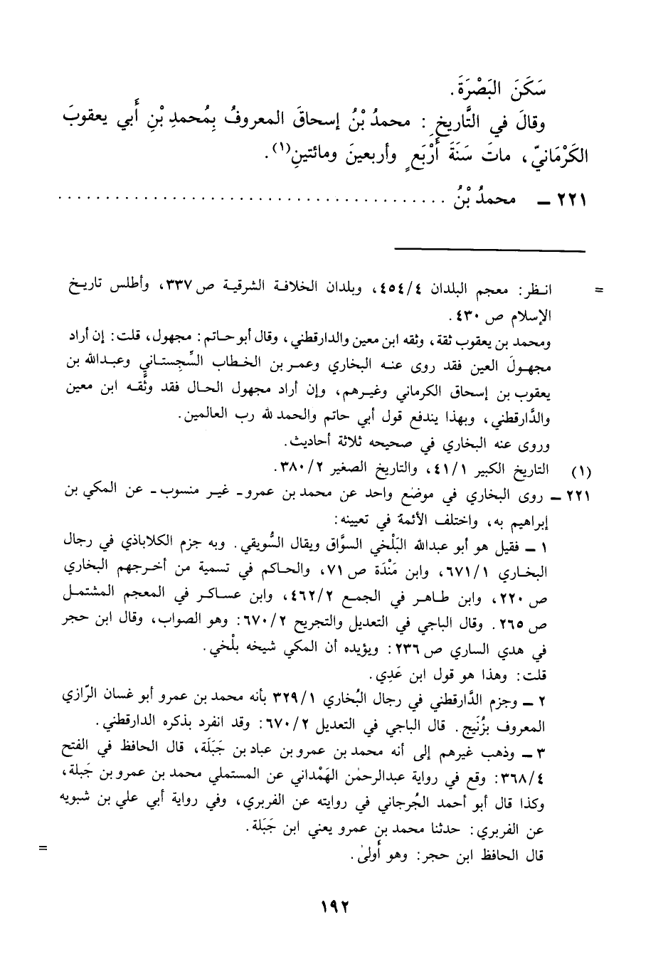 وَقَالَ فِي التَّارِيخ مُحَمَّد بن إِسْحَاق الْمَعْرُوف بِمُحَمد بن أبي يَعْقُوب الْكرْمَانِي مَاتَ سنة أَربع وَأَرْبَعين وَمِائَتَيْنِ