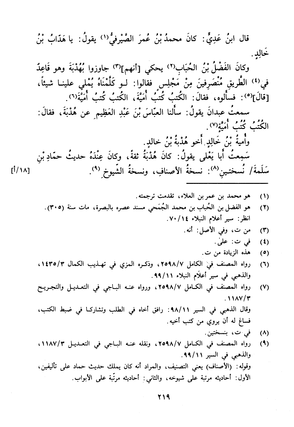 سَمِعت أَبَا يعلى يَقُول كَانَ هدبة ثِقَة وَكَانَ عِنْده حَدِيث حَمَّاد بن سَلمَة نسختين نُسْخَة الْأَصْنَاف ونسخة الشُّيُوخ [18 أ]