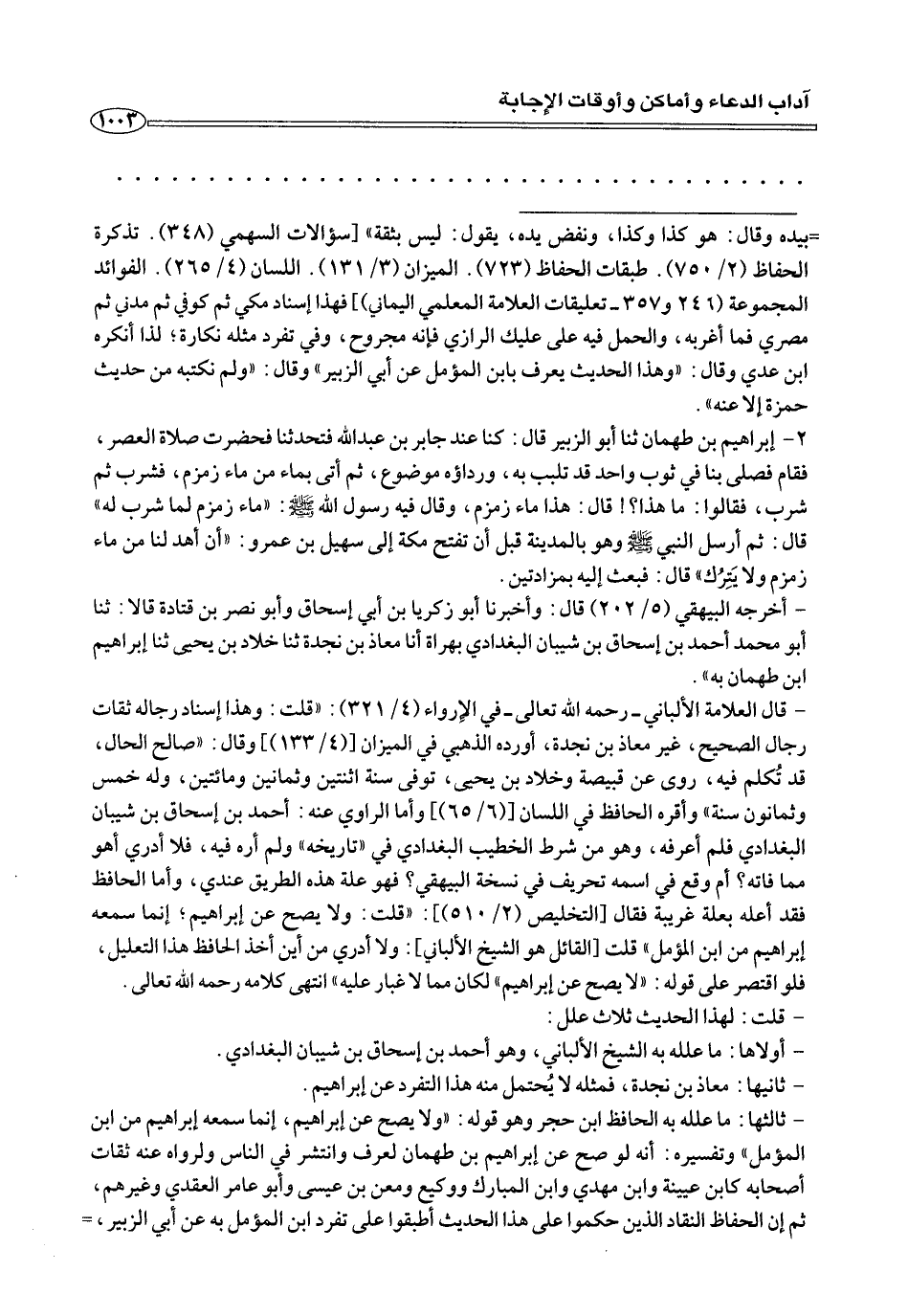 - ثالثها: ما علله به الحافظ ابن حجر وهو قوله: «ولا يصحح عن إبراهيم، إنما سمعه إبراهيم من ابن المؤمل» وتفسيره: أنه لو صح عن إبراهيم بن طهمان لعرف وانتشر في الناس ولرواه عنه ثقات أصحابه كابن عيينة وابن مهدي وابن المبارك ووكيع ومعن بن عيسي وأبو عامر العقدي وغيرهم، ثم إن الحفاظ النقاد الذي حكموا علي هذا الحديث أطبقوا علي تفرد ابن المؤمل به عن أبي الزبير،=