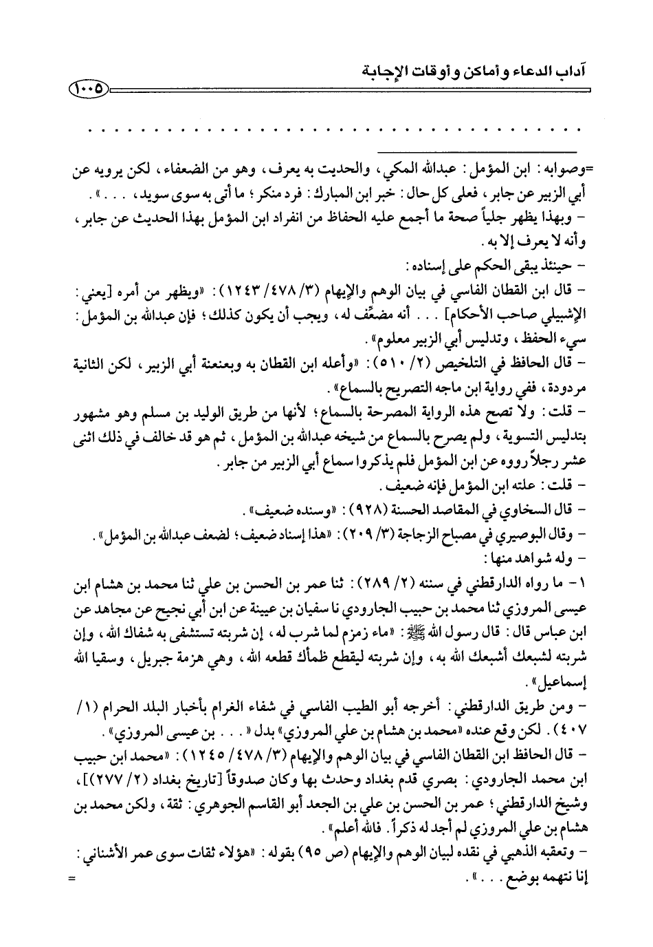 - قال ابن القطان الفاسى في بيان الوهم والإيهام (٣/ ٤٧٨/ ١٢٤٣): «ويظهر من أمره [يعني: الإشبيلى صاحب الأحكان] ... أنه مضعف له، ويجب أن يكون كذلك؛ فإن عبد الله بن المؤمل: سيء الحفظ، وتدليس أبي الزبير معلوم».