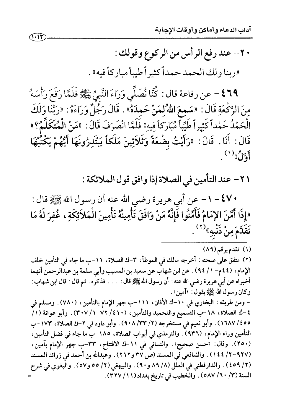 ٤٦٩ - عن رفاعة قَالَ: كُنَّا نُصَلِّي وَرَاءَ النَّبِيَّ صلى الله عليه وسلم فَلَمَّا رَفَعَ رَأْسَهُ مِنَ الرَّكْعَةِ قَالَ: «سَمِعَ اللهُ لِمَنْ حَمِدَهُ». قَالَ رَجُلٌ وَرَاءَهُ: «رَبَّنَا وَلَكَ الْحَمْدُ حَمْدًا كَثِيرًا طَيِّبًا مُبَارَكًا فِيهِ» فَلَمَّا انْصَرَفَ قَالَ: «مَنْ الْمُتَكَلِّمُ؟» قَالَ: أَنَا. قَالَ: «رَأَيْتُ بِضْعَةً وَثَلَاثِينَ مَلَكًا يَبْتَدِرُونَهَا أَيُّهُمْ يَكْتُبُهَا أَوَّلُ» (¬١).