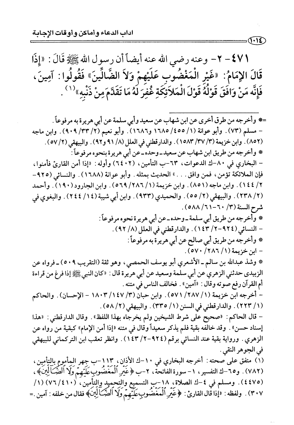 ٤٧١ - ٢ - وعنه رضي الله عنه أيضًا أن رسول الله صلى الله عليه وسلم قَالَ: «إَذَا قَالَ الإِمَامُ: «غَيْرِ الْمَغْضُوبِ عَلَيْهِمْ وَلَا الضَّالِّينَ» فَقُولُوا: آمِينَ، فَإِنَّه مَنْ وَافَقَ قَوْلُهُ الْمَلَائِكَةِ غُفِرَ لَهُ مَا تَقَدَّمَ مِنْ ذَنْبِهِ» (¬١) .