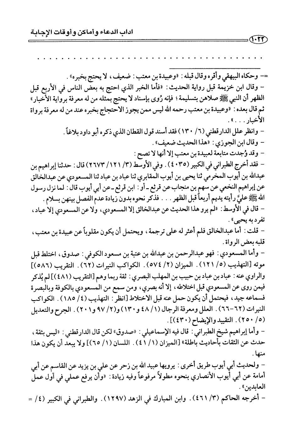 - وأما المسعودي: فهو عبد الرحمن بن عبد الله بن عتبة بن مسعود الكوفي: صدوق، اختلط قبل موته [التهذيب (٥/ ١٢١). الميزان (٢/ ٥٧٤). الكواكب النيرات (٦٢). التقريب (٣٨٦)] والراوي عنه: عباد بن عباد حبيب بن المهلب البصري: ثقة ربما وهم [التقريب (٤٨١)] لم يذكر فيمن روى عن المسعودي قبل اختلاطه، إلا أنه بصري، ومن سمع من المسعودي بالكوفة والبصرة فسماعة جيد، فيحتمل أن يكون حمل عنه قبل الاختلاط [انظر: التهذيب (٤/ ١٨٥). الكواكب النيرات (٦٢/ ٦٦). العلل ومعرفة الرجال (١/ ٤٨ و ١٣٠) و (٢/ ٩٧ و ٢٠١). الجرح والتعديل (٥/ ٢٥٠). التقييد والإبضاح (٤٣٠)].