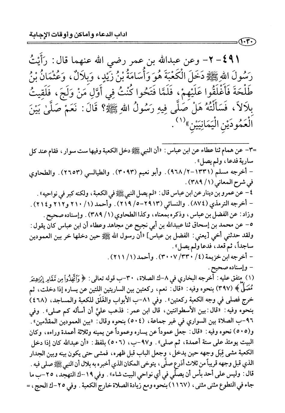 ٤٩١ - ٢ - وعن عبد الله بن عمر رضي الله عنهما قَالَ: رَأَيْتُ رَسُولَ اللهِ صلى الله عليه وسلم دَخَلَ الْكَعْبَةَ هُوَ وَأُسَامَةُ بْنُ زَيْدٍ، وَبِلَالٌ، وَعُثْمَانُ بْنُ طَلْحَةَ فَأَغْلَقُوا عَلَيْهِمْ، فَلَمَّا فَتَحُوا كُنْتُ فِي أَوَّلِ مَنْ وَلَجَ، فَلَقِيتُ بِلَالًا، فَسَأَلْتُهُ هَلْ صَلَّى فِيهِ رَسُولُ اللهِ صلى الله عليه وسلم؟ قَالَ: نَعَمْ صَلَّى بَيْنَ الْعَمُودَيْنِ الْيَمَانِيَيْنِ» (¬١) .