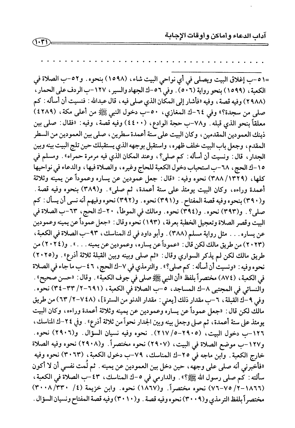 =٥١ - ب إغلاق البيت ويصلي في أي نواحي البيت شاء، (١٥٩٨) بنحوه. و ٥٢ - ب الصلاة الكعبة، (١٥٩٩) بنحو رواية (٥٠٦). وفي- ك الجهاد والسير، ١٢٧ - ب الردف علي الحمار، (٢٩٨٨) ووفيه قصة، وفيه فأشار إلي المكان الذي فيه، قال عبد الله: فنسيت أن أساله: كم صلي من سجده؟» وفي ٦٤ - ك المغازي، ٥٠ - ب دخول النبي صلى الله عليه وسلم من أعلي مكة، (٤٢٨٩) معلقًا بنحو الذي قبله. و ٧٨ - ب حجة الوادع، (٤٤٠٠) وفيه قصة، وفيه: «فقال: صلي بين ذينك العمودين المقدمين، وكان البيت علي ستة أعمدة سطرين، صلي بين العمودين من السكر المقدم، وجلع باب البيت خلف ظهره، واستقبل بوجهه الذي يستقبلك حين تلج البيت بينه وبين الجدار، قال: ونسيت أن أسأله: كم صلي؟، وعند المكان الذي فيه مرمرة حمراء». ومسلم في ١٥ - ك الحج، ٦٨ - ب استجاب دخول الكبعبة للحاج وغيره، والصلاة فيها، والدعاء في نواحيها كلها، (١٣٢٩/ ٣٨٨) نحوه وفيه: «قال: جعل عمودين عن يساره وعمودًا عن يمينه وثلاثة أعمدة وراءه، وكان البيت يومئذ علي ستة أعمدة، ثم صلي». و (٣٨٩) بنحوه وفيه قصة. و (٣٩٠) بنحوه وفيه قصة المفتاح. و (٣٩١) نحه. و (٣٩٢) نحوه وفيهم أنه يسأل: كم صلي؟ .. و (٣٩٣) نحوه. ومالك في الموطأ، ٢٠ - ك الحج، ٦٣ - ب الصلاة في البيت وقصر الصلاة وتعجيل الخطبة بعرفة، (١٩٣) نحوه وقال: «جعل عمودًا عن يمينه وعمودين عن يساره ... مثل رواية مسلم (٣٨٨). وأبو داود في ك المناسك، ٩٣ - ب الصلاة في الكعبة، (٢٠٢٣) من طريق مالك لكن قال: «عمودًا عن يساره، وعمودين عن يمينه ... ». و (٢٠٢٤) من طريق مالك لكن لم يذكر السواري وقال: «ثم صلي وبينه وبين القبلة ثلاثة أذرع». و (٢٠٢٥) نحوه وفيه: «ونسيت أن أسأله: كم صلي؟». والترمذي في ٧ - ك الحج، ٤٦ - ب ما جاء في الصلاة في الكعبة، (٨٧٤) مختصرًا بلفظ» أن النبي صلى الله عليه وسلم صلي في جوف الكعبة». وقال: «حسن صحيح». والنسائي في المجتبي ٨ - ك المساجد، ٥ - الصلاة في الكعبة،» ٦٩١ - ٢/ ٣٣ - ٣٤) نحوه. وفي ٩ - ك القبلة، ٦ - ب مقدار ذلك [يعني: مقدار الدنو من السترة]، (٧٤٨ - ٢/ ٦٣) من طريق مالك لكن قال: «جعل عمودًا عن يساره وعمودين عن يمينه وثلاثة أعمدة وراءه، وكان البيت يومئذ علي ستة أعمدة، ثم صلي وجعل بينه وبين الجدار نحوًا من ثلاثة أذرع». وفي ٢٤ - ك المناسك، ١٢٦ - ب دخول البيت، (٢٩٠٥ - ٥/ ٢١٧). نحوه وفيه نسيان السؤال. و (٢٩٠٦) نحوه. و ١٢٧ - ب موضع الصلاة في البيت، (٢٩٠٧) نحوه مختصرًا. و (٢٩٠٨) نحوه وفيه الصلاة خارج الكعبة. وابن ماجه في ٢٥ - ك المناسك، ٧٩ - ب دخول الكعبة، (٣٠٦٣) نحوه وفيه» فاخبرني أنه صلي علي وجهه، حين دخل بين العمودين عن يمينه. ثم لمت نفسي أن لا أكون سألته: كم صلي رسول الله صلى الله عليه وسلم؟». والدارمي في ٥ - ك المناسك، ٤٣ - ب الصلاة في الكعبة، (١٨٦٦ - ٢/ ٧٥ - ٧٦) نحوه مختصرًا. و (١٨٦٧) نحوه. وابن خزيمة (٤/ ٣٣٠/ ٣٠٠٨) متصرًا بلفظ الترمذي و (٣٠٠٩) نحوه وفيه قصة. و (٣٠١٠) وفيه قصة المفتاح ونسيان السؤال. =