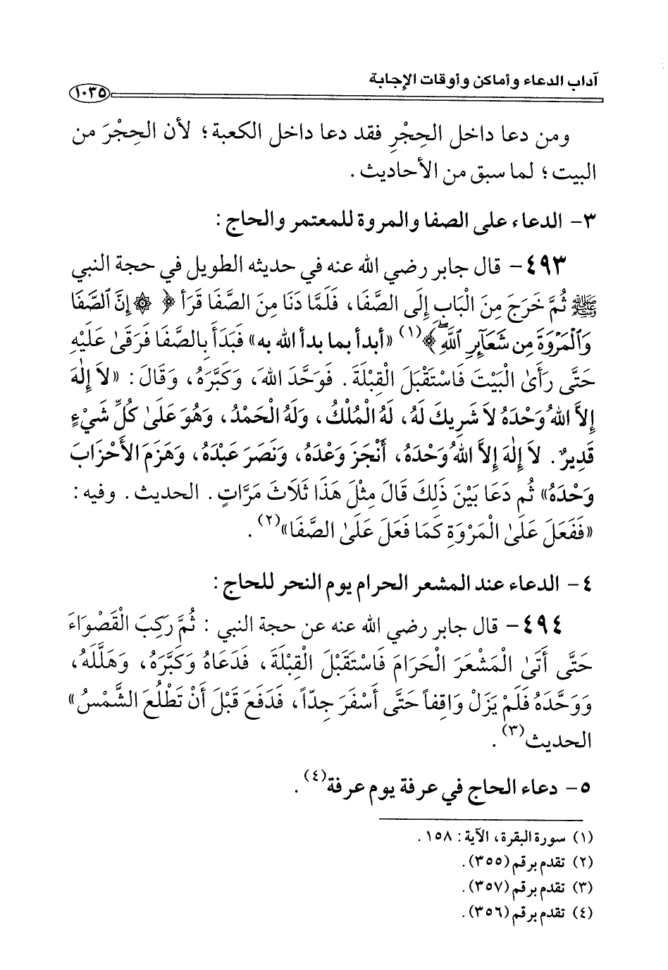 ٤٩٣ - قَالَ جابر رضي الله عنه فِي حديثه الطويل فِي حجة النبي صلى الله عليه وسلم ثُمَّ خَرَجَ مِنَ الْبَابِ إِلَى الصَّفَا، فَلَمَّا دَنَا مِنَ الصَّفَا قَرَأ {*إن الصفا والمروة من شعائر الله} (¬١) «أبدأ بما بدأ الله به» فَبَدَأَ بِالصَّفَا فَرَقَى عَلَيْهِ حَتَّى رَأَى الْبَيْتَ فَاسْتَقْبَلَ الْقِبْلَةَ. فَوَحَّدَ اللهَ، وَكَبَّرَهُ، وقَالَ: «لَا إِلهَ إِلَّا للهُ وَحْدَهُ لَا شَرِيكَ لَهُ، لَهُ الْمُلْكُ، وَلَهُ الْحَمْدُ، وَهُوَ عَلَى كُلِّ شَيْءٍ قَدِيرٌ. لَا إِلهَ إِلَّا اللهُ وَحْدَهُ، أَنْجَزَ وَعْدَهُ، وَنَصَرَ عَبْدَهُ، وَهَزَمَ الأَحْزَابَ وَحْدَهُ» ثُمَّ دَعَا بَيْنَ ذَلِكَ قَالَ مثل هَذَا ثَلَاثَ مَرَّاتٍ. الحديث. وفيه: «فَفَعَلَ عَلَى الْمَرْوَةِ كَمَا فَعَلَ عَلَى الصَّفَا» (¬٢).