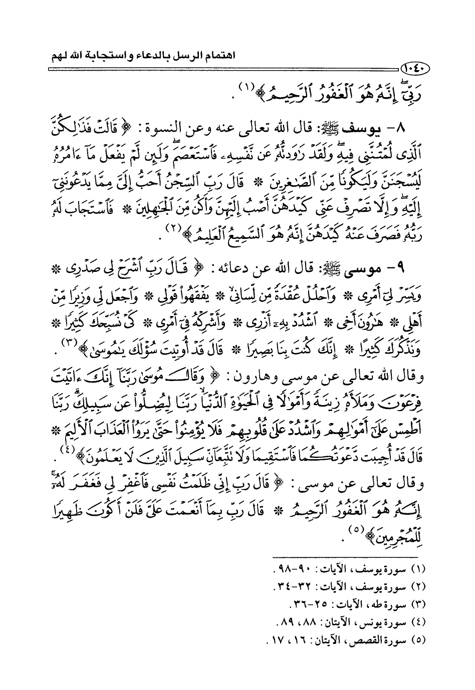 ٩ - مُوسَى صلى الله عليه وسلم: قَالَ الله عن دعائه: {قَالَ رب أشرح لِيصدري * ويسر لِيأمري * وأحلل عقده من لساني * يفقهوا قولي * وأجعل لِيوزير من أهلي * هرون أخي * اشدد بِهِ أزري * وأشركه فِي أمري * كي نسبحك كثيرا * ونذكرك كثيرا * إنك كُنْتُ بنا بصيرا * قَالَ قَدْ أوتيت سؤلك يموسي} (¬٣).