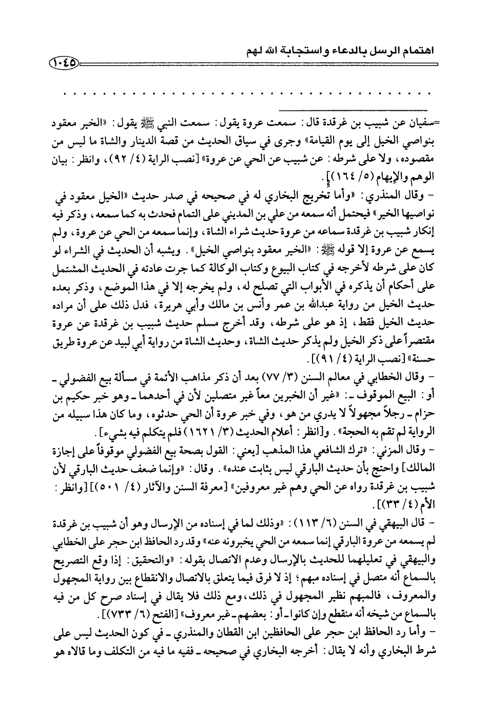 - قال البيهقي في السنن (٦/ ١١٣): «وذلك لما في إسناده من الإرسال وهو أن شبيب بن غرقدة لم يسمعه من عروة البارقي إنما سمعه من الحي يخبرونه عنه» وقد رد الحافظ اب حجر علي الخطايي والبيهقي في تعليهما للحديث با لإرسال وعدم الاتصال بقوله: «والتحقيق: إذا وقع التصريح بالسماع أنه متصل في إسناده بهم؛ إذ لا فرق فيما يتعلق بالاتصال والانقطاع بين رواي المجهول والمعروف، فالمبهم نظير المجهول في ذلك، ومع ذلك فلا يقال في إسناد صرح كل من فيه بالسماع من شيخه أنه متقطع وإن كانوا- أو: بعضهم- غير معروف» [الفتح (٦/ ٧٣٣)].