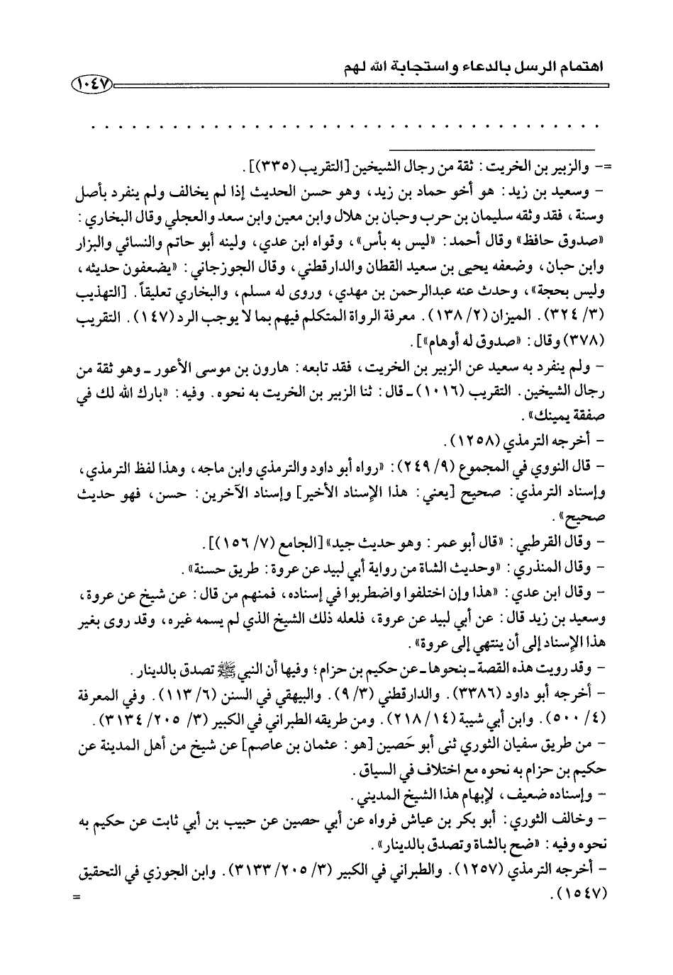 - وَلَمْ ينفرد به سعد عن الزبير بن الخريت، فقد تابعه: هارون بن موسى الأعور- وهو ثقة من رجال الشيخين. التقريب (١٠١٦) - قال: ثنا الزبير بن الخريت به نحوه. وفيه: بارك الله لك في صفقة يمينك».