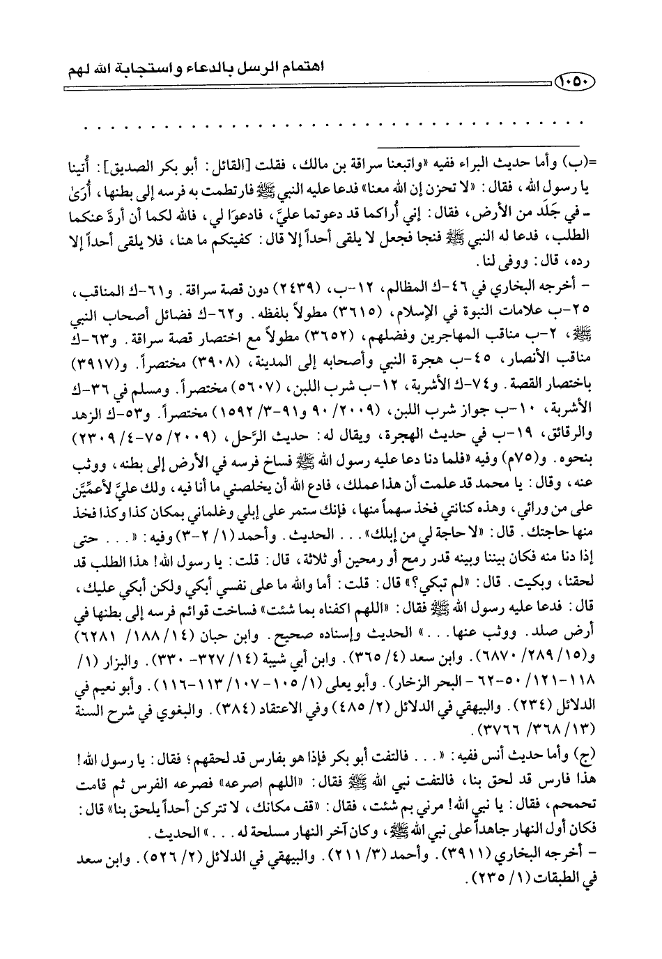 = (ب) وأما حديث البراء ففيه» واتبعا سراقة بن مالك، فقلت [القاتل: أبو بكر الصديق]: أتينا يا رسول الله، فقال: «لا تحزن إن الله معنا» فدعا عليه النبي صلى الله عليه وسلم فارتطمت به فرسه إلي بطنها، أري في جلد الأرض، فقال: إني أراكما قد دعوتما علي، فادعوا لي، فالله لكما أن أرد عنكما الطلب، فدعا له النبي صلى الله عليه وسلم فنجا فجعل لا يلقي أحدًا إلا قال: كفيتكم ما هنا، فلا يلقي أحدًا إلا رده، قال: ووفي لنا.